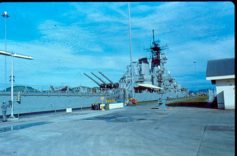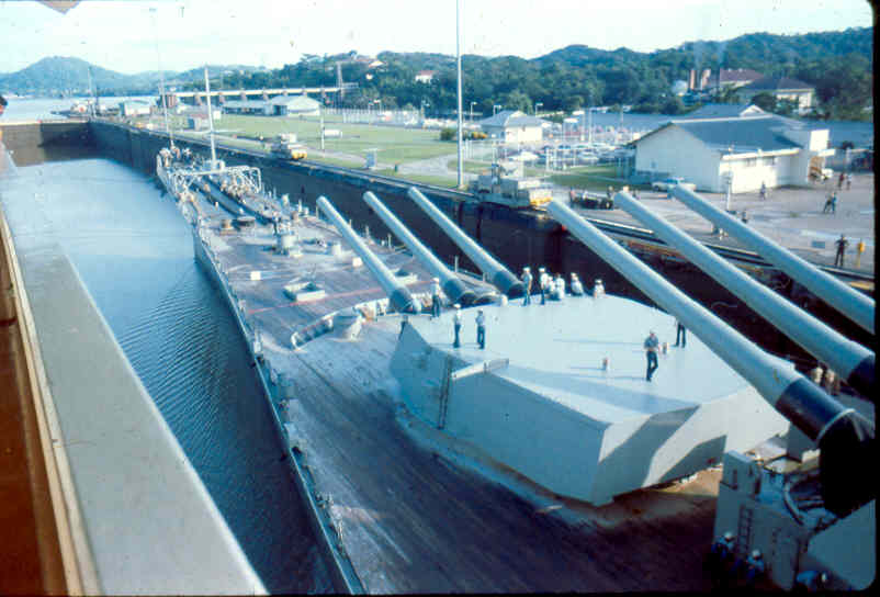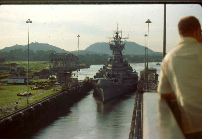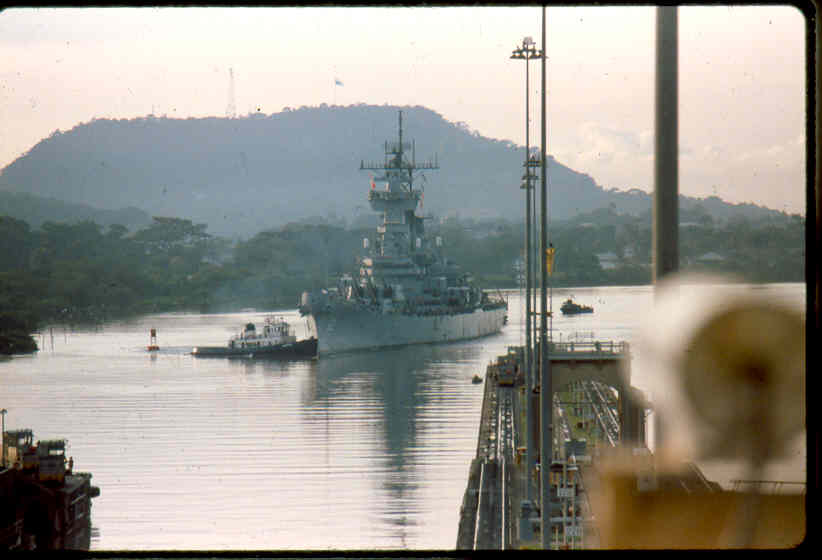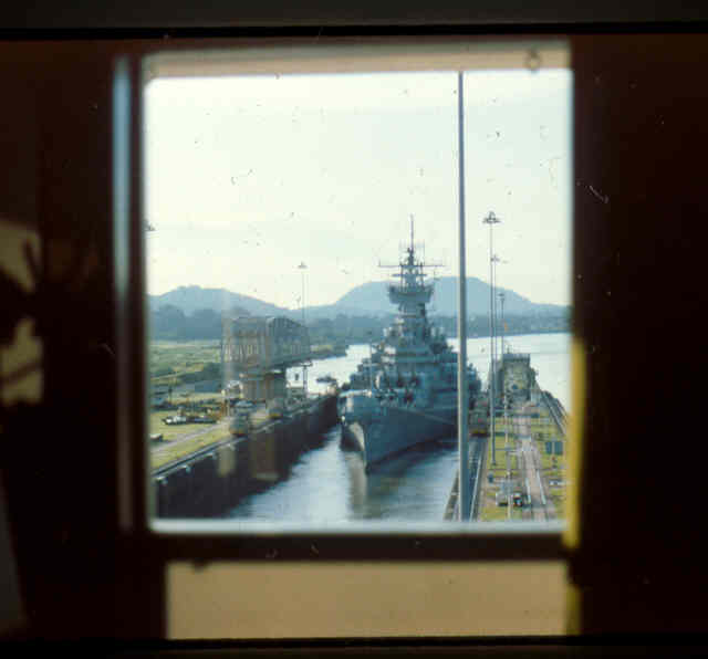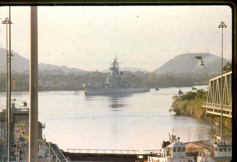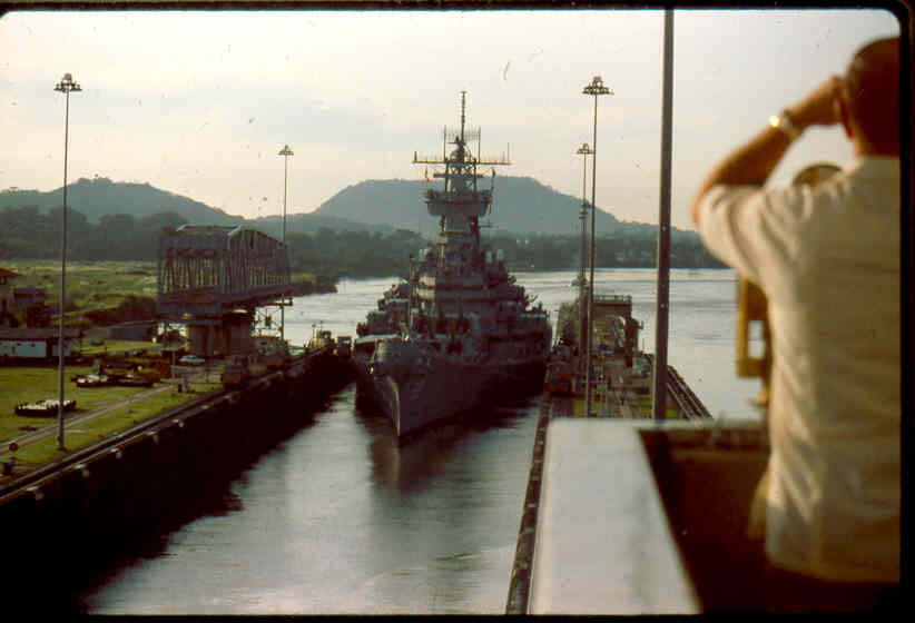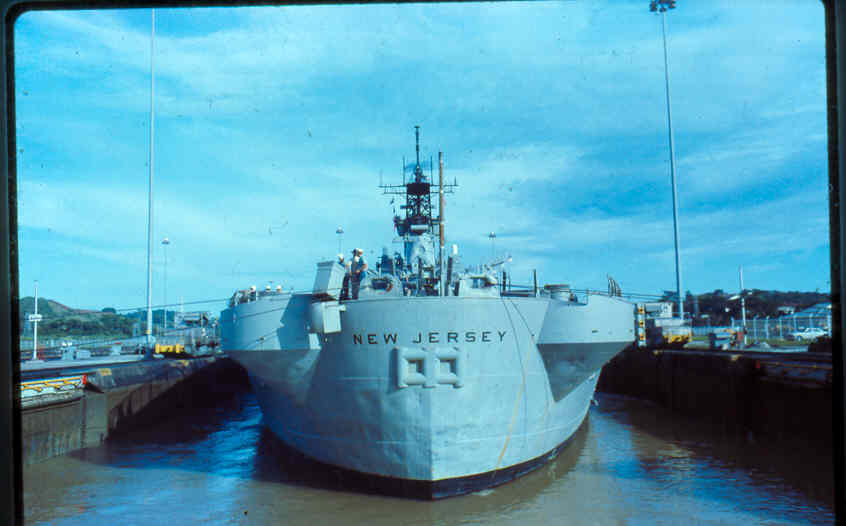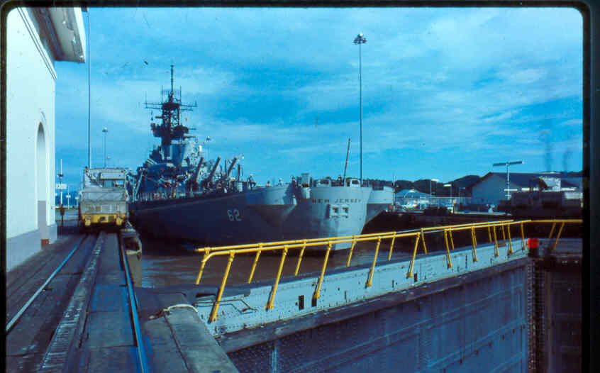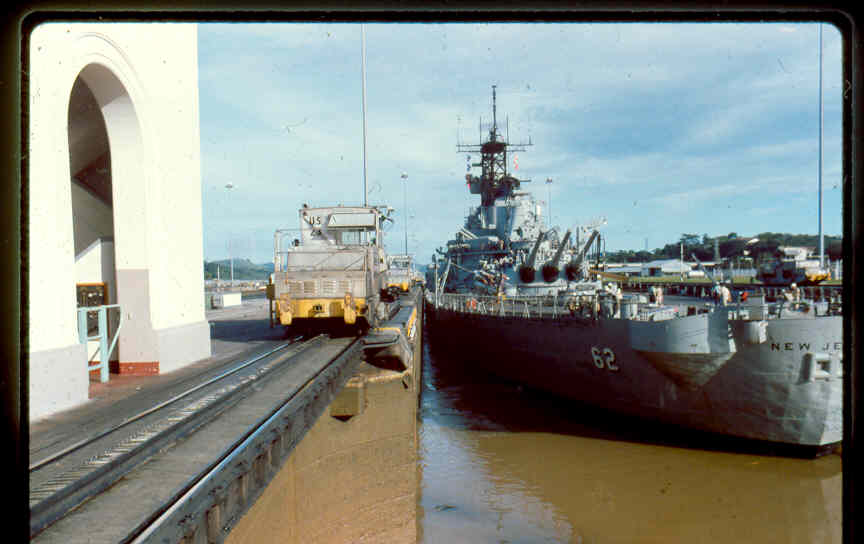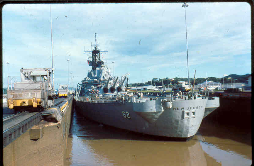 | Here is a photo of Jimmy lee Slover and the New Jersey at Miraflores Locks in the Canal Zone back when Jimmy Lee Slover was a Senior Control House Operator. The New Jersey is in the upper east chamber going south to the Pacific Ocean. Pictures are 1983. This is about the last time the New Jersey navigated the Panama Canal under her own power. |