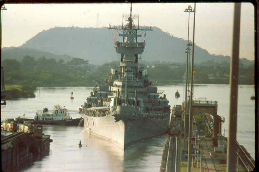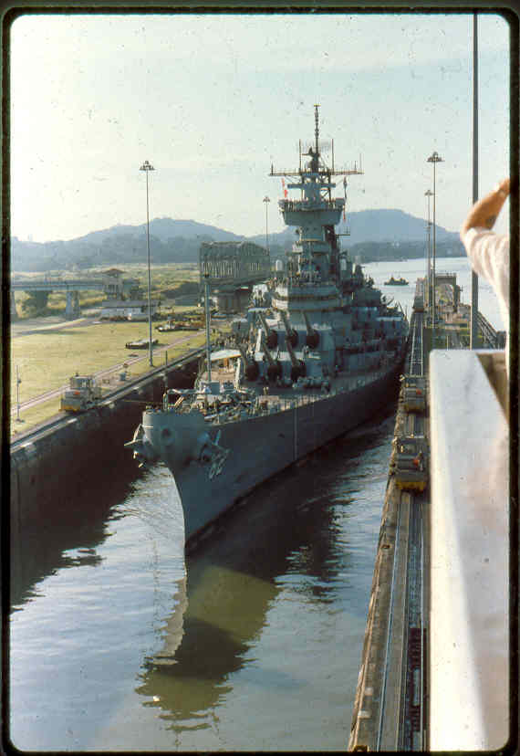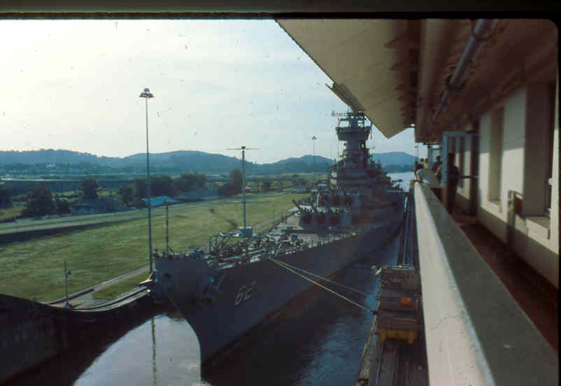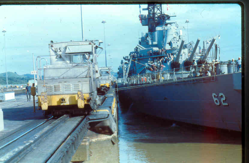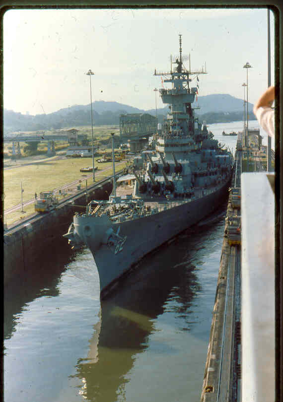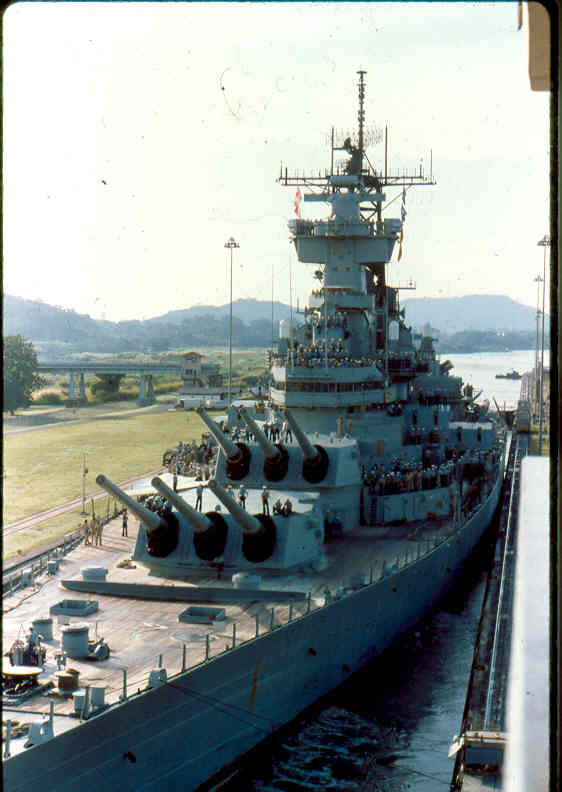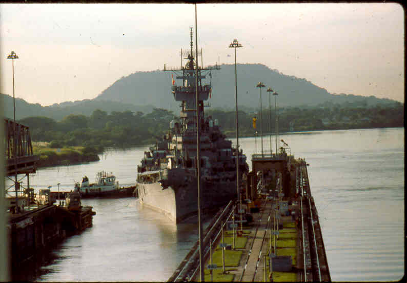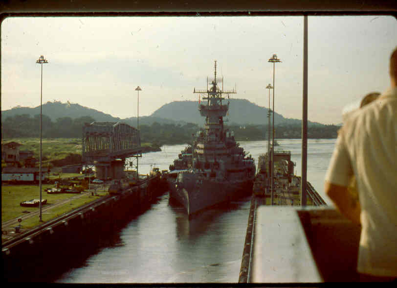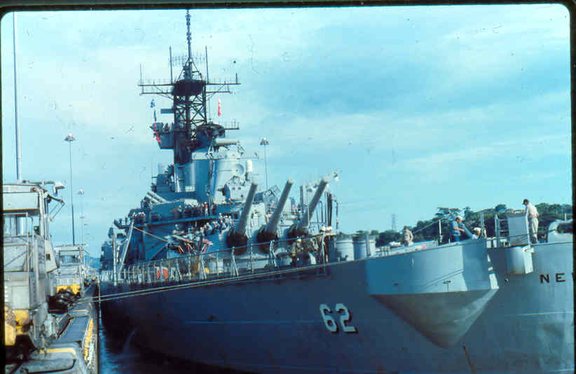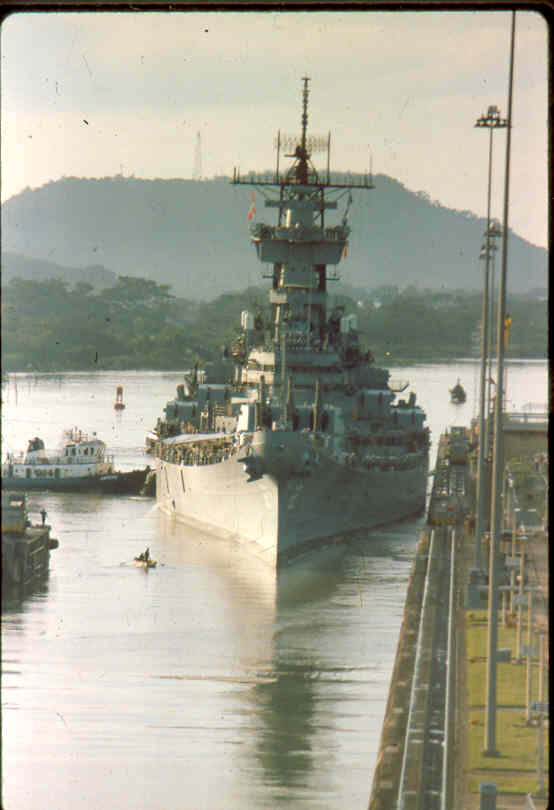| Here is a photo of Jimmy lee Slover and the New Jersey at Miraflores Locks in the Canal Zone back when Jimmy Lee Slover was a Senior Control House Operator. The New Jersey is in the upper east chamber going south to the Pacific Ocean. Pictures are 1983. This is about the last time the New Jersey navigated the Panama Canal under her own power. |