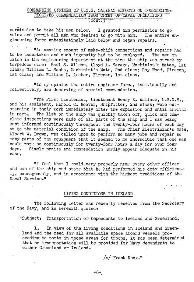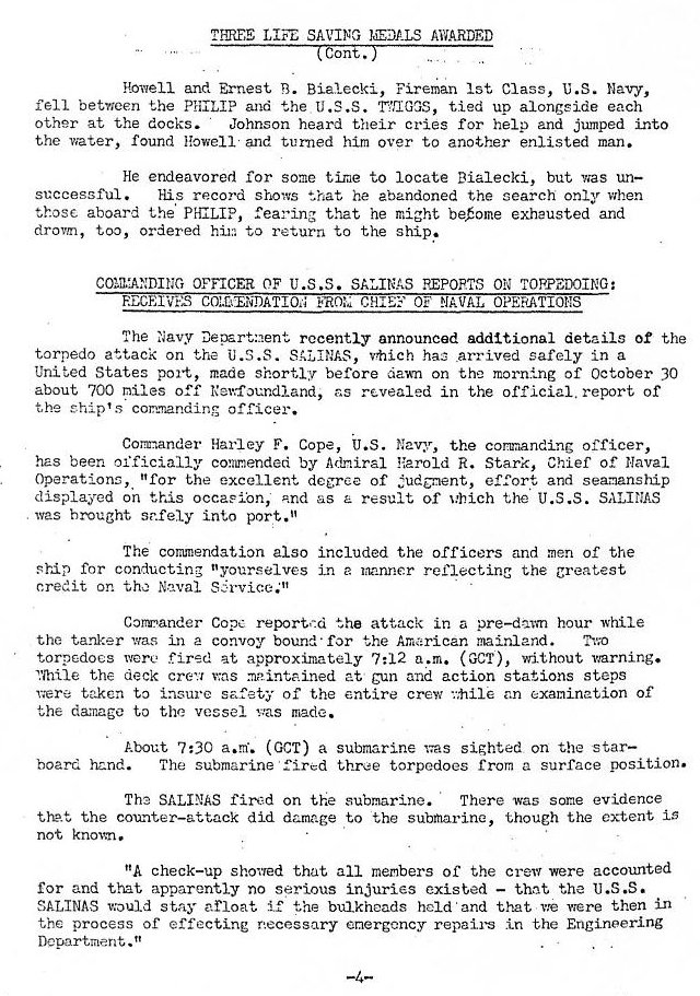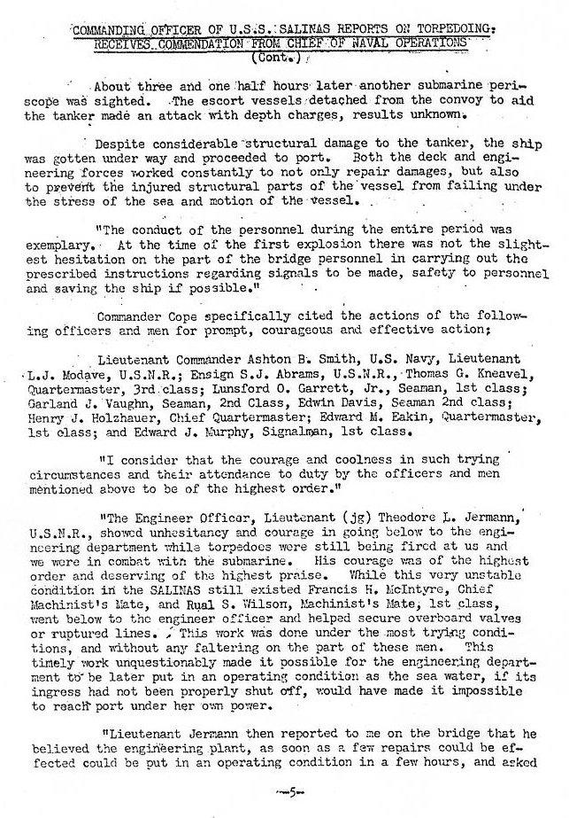 U.S.S. SALINAS REPORTS ON TORPEDOING