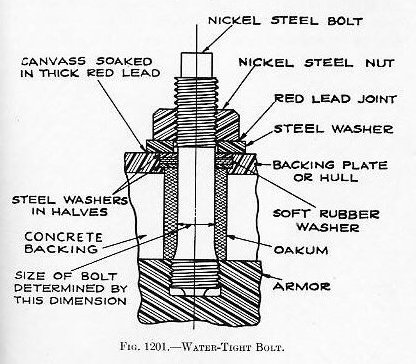 Class A armor is bolted to the skin of the ship, or to her framing and bulkheads, with heavy bolts of special design called “armor bolts.” As it is impossible to fit the armor plate snug against the shell plate, this support is provided by standing the armor off from the plating, leaving a space about 2 inches wide between the plating and the armor. This space is then filled with concrete which provides an equally distributed support to the armor over its full surface. (See Fig. 1201.)