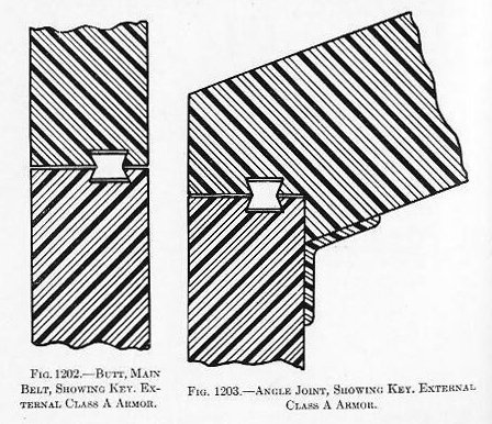 Class B or deck armor, however, is generally worked into the structure. Deck armor, except with the heaviest plates, is riveted as in ordinary plating. The heaviest plates in decks and the tops of turrets and conning towers are secured with bolts in a similar manner to class A plates except no backing is used.