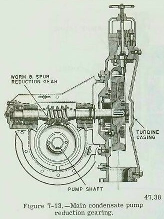 In the reduction gears used on a turbine-drive main condensate pump, shown in figure 7-13, a worm shaft and worm wheel reduce the turbine speed of 5534 rpm to the pump speed of 1145 rpm. The worm is cut in a solid, low carbon, nickel-steel forging. It is carried in two babbitt-lined split sleeve bearings and is located axially by a collar type thrust element. One end is tapered for mounting the turbine wheel while the other is squared for the application of a turning wrench.
