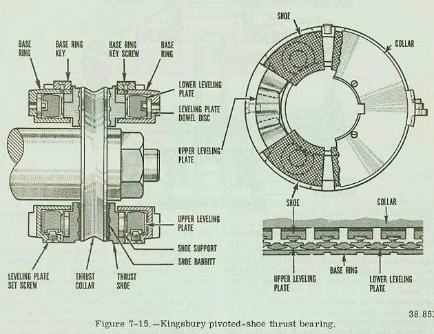Although bearings in main propulsion units vary greatly in size, composition and lubrication, their purposes are the same. Bearings are used to guide and support rotating or reciprocating elements and to prevent free axial or radial movement of these elements. Radial or journal bearings are designed to carry loads applied in a plane perpendicular to the axis of the shaft. Thrust bearings are designed to carry loads applied in the same direction as the axis of the shaft and are used to prevent free endwise movement.