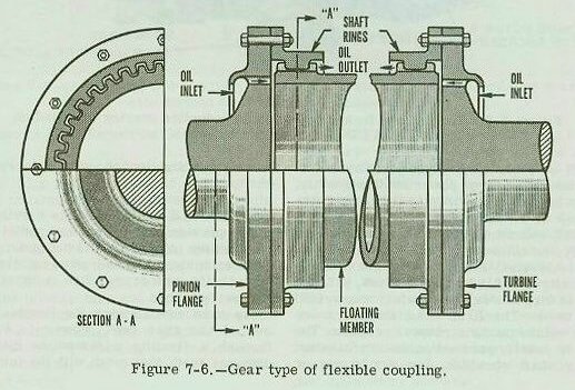 Figure 7-6 illustrates the design of the gear type flexible couplings that connect the main turbines to the high speed pinions of the main reduction gear. The couplings also allow for expansion of the turbine shafts, and take care of any slight misalignment between the main turbines and the reduction gears.