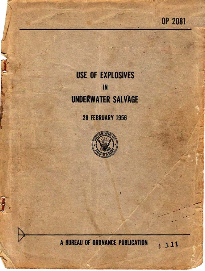This page comes courtesy of our friend, Jack Lehman, First Class Diver US Navy Ret. Jack was kind enough to lend us his copy for scanning for which we thank him. Jack entered the Navy in March of 1944 and reported to the USS Saratoga CV-3 in June. In 1946 he participated in Operation Crossroads, the testing of two A-Bombs at Bikini Island. As he worked his way up, he served on USS Petrel ASR14, USS Skylark ASR20, USS Sunbird ASR15 and USS Howard Gilmore AS 16. He was commissioned in in 1962 and retired from the Navy in 1967. In 1966 Jack was the diver responsible for recovering the H-bomb, which had fallen into the sea off Spain. It was lost in a midair refueling operation on 1 January and recovered 7 April. At some point we hope to have a page with photos Jack took on that day. Ordnance Pamphlet 2081 describes the techniques for use of explosives and other demolition material in underwater salvage activities: harbor clearance, harbor bottom alteration, rock and concrete blasting, steel and timber cutting and removal of propellers for replacement. The publication also reviews the fundamental characteristics of explosives and contains information about demolition equipment. This publication is intended for use by all personnel responsible for planning and performance of underwater salvage.