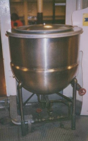 STEAM KETTLE: NOTE THE RED VALVES THAT ARE USED TO CONTROL THE STEAM. THIS KETTLE WILL HOLD ABOUT 300 POUNDS OF SPUDS. THE COOKS SAY THAT IT TAKES ABOUT 3 MINUTES TO COOK THE SPUDS. THE SPUDS WERE ALWAYS HARD WHICH I NEVER CONSIDERED COOKED. I GUESS I JUST DON'T KNOW HOW TO COOK. |