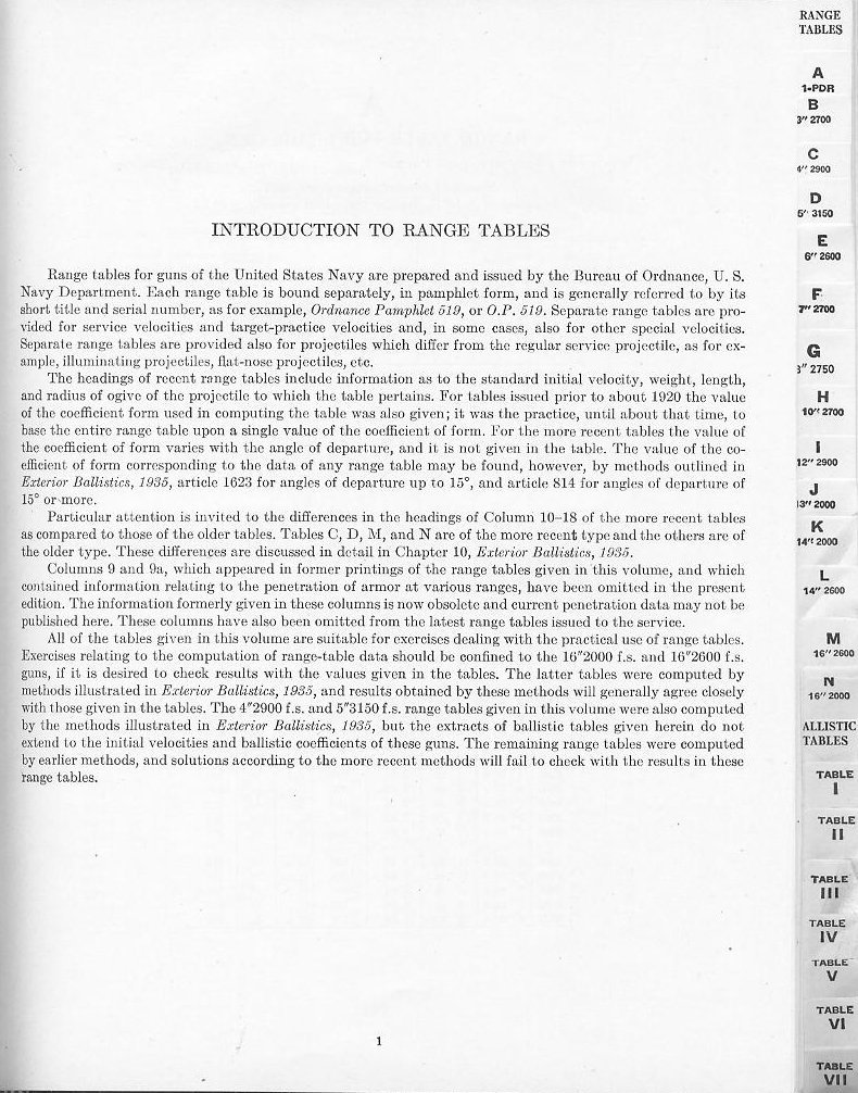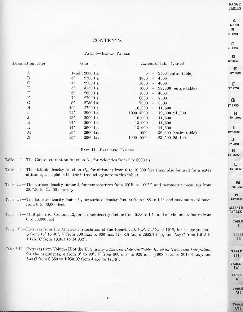 HOME INDEX CONTENTS PART I - RANGE TABLES A 1-pdr. 2000 f.s. 0 - 3500 (entire table) B 3" 2700 f.s. 3000 - 4500 C 4" 2900 f.s. 1000 - 4000 D 5" 3150 f.s.1000 - 22,600 (entire table) E 6" 2600 f.s. 1000 - 4000 F 7" 2700 f.s. 6000 - 7500 G 8" 2750 f.s. 7000 - 8500 H 10" 2700 f.s. 10,000 - 11,500 I 12" 2900 f.s.1000 - 4000 -19,000 - 24,000 J 13" 2000 f.s. 10,000 - 11,500 K 14" 2000 f.s (REDUCED CHARGE) 13,000 - 14,500 L 14" 2600 f.s. (FULL CHARGE) 13,000 - 14,500 M 16" 2600 f.s.(FULL CHARGE) 1000 - 39,600 (entire table) N 16" 2000 f.s.(REDUCED CHARGE) 1000 - 4000 - 23,500 - 25,100 PART II - BALLISTIC TABLES TABLE I - The Gavre retardation function G., for velocities from 0 to 6000 f.s. TABLE II - The altitude-density function Hv, for altitudes from 0 to 10,000 feet (may also be used for greater altitudes, as explained in the introductory note to this table). TABLE III - The surface density factor, for temperatures from 20 degrees F. to 100 degrees F. and barometric pressures from 28."50 to 31."00 mercury. TABLE IV - The ballistic density factor, for surface density factors from 0.88 to 1.14 and maximum ordinates from 0 to 30,000 feet. TABLE V - Multipliers for Column 12, for surface density factors from 0.88 to 1.14 and maximum ordinates from 0 to 30,000 feet. TABLE VI - Extracts from the American translation of the French A.L.V.F Tables of 1918, for the arguments, from 15 degrees to 40 degrees, V from 600 m.s. to 900 m.s. (1968.5 f.s. to 2952.7 f.s.), and Log C from 1.015 to 1.175 (C from 10.351 to 14.962). TABLE VII - Extracts from Volume II of the U. S. Army's Exterior Ballistic Tables Based on Numerical Intergration, for the arguments, from 0 degrees to 90 degrees, V from 600 m.s. to 920 m.s. (1968.5 f.s. to 3018.3 f.s.), and Log C from 0.650 to 1.250 (C from 4.467 to 17.78). |