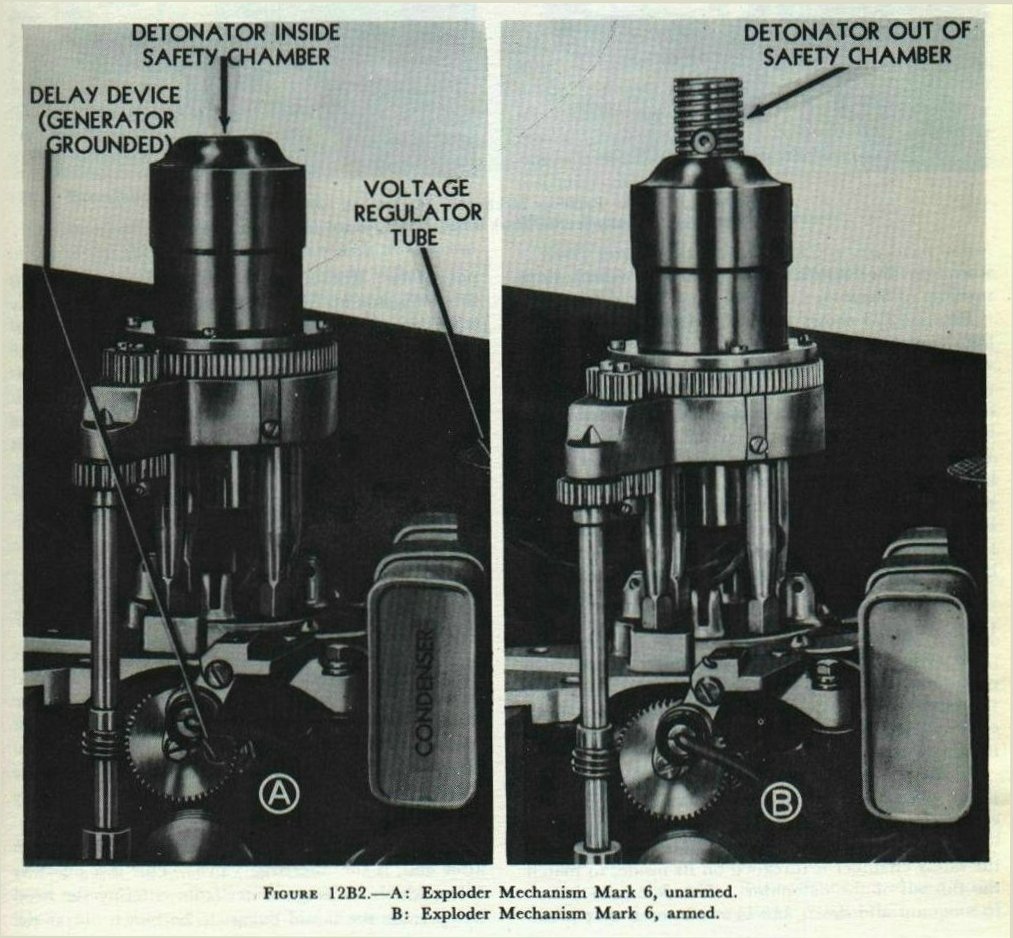 Figure 12B2 shows the Mark 6 exploder in both the unarmed and armed condition. The exploder’s principal safety device is the safety chamber, which may be seen at the top of the pictures. When the exploder is unarmed, the detonator is housed within the safety chamber. If the detonator should explode prematurely within the safety chamber, it could not detonate the booster charge. As the exploder arms, the detonator rises out of the safety chamber to its position within the booster cavity. On impact with the target, the detonator of the Mark 6 exploder is fired by a charge of electricity stored in a large condenser. During the first part of the torpedo run, the condenser is charged by the out-put of a direct-current generator driven by the impeller shaft. The generator output passes through a voltage-regulator tube, which keeps its voltage nearly constant regardless of generator speed. A second safety feature is provided by the delay device indicated in figure 12B2, part A. A spring-loaded contact grounds the generator output through the delay wheel. As the torpedo moves through the water, the delay wheel is turned by a worm on the vertical shaft (at the left in figure 12B2). After a short tune, a hole in the delay wheel reaches the spring-loaded contact. The contact falls into the hole, and the generator output is no longer grounded. At the same time, a blank sector on the wheel reaches the worm on the vertical shaft, and the wheel stops turning. |
