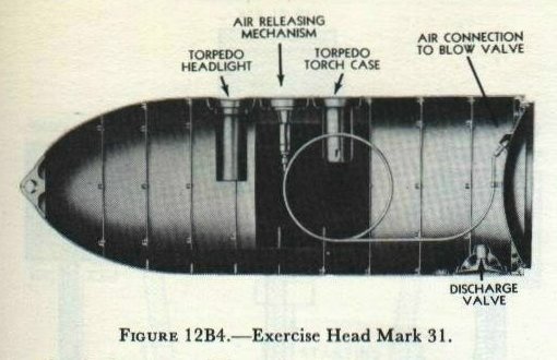 12B6. Exercise head construction At the present time, Exercise Head Mark 31 is used with Mark 15 torpedoes. Figure 12B4 shows a sectional view of this exercise head. The exercise head has the same shape and size as the war head. And, like the war head, it is closed at its after end by a concave bulkhead. The exercise head, however, is made of steel rather than phosphor bronze. The war head is strengthened by the high-explosive charge, which completely fills it. Since the exercise head contains no explosive, it is reinforced by a series of nine strengthening rings. In the bottom of the exercise head shell, near the after end, is the discharge valve. This is a one-way valve, which keeps sea water from entering the head but permits the liquid ballast to be blown out at the end of the run. The air-releasing mechanism is mounted on a flange at the top of the exercise head shell, and connected by a length of pipe to a fitting in the bulkhead. The pipe is always provided with one or more loops, to prevent any danger of breakage due to fatigue. Two additional flanges, on which various accessories may he mounted, are provided at the top of the head. 12B7. Exercise head accessories One or more accessories are mounted on the flanges in the top of the exercise head, according to the conditions under which the exercise torpedo is fired. The headlight helps the recovery crew to locate a torpedo that has been fired at night. It contains a bulb and a set of flashlight batteries. An inertia switch in the headlight case turns the light on when the torpedo is fired. A torch pot helps in locating an exercise torpedo in the daytime. The torch pot contains a chemical that gives off smoke when it gets wet. A metal seal on the torch pot case is removed shortly before firing. When the torpedo is fired, water seeps into the case, and the torch pot begins to smoke. The depth and roll recorder is a mechanical device that helps in the evaluation of the torpedo’s performance during an exercise run. Throughout the run, it makes a continuous graphic record of the torpedo’s running depth and angle of roll. A pinger is a sound-making device. It is sometimes used when an exercise torpedo is fired in relatively shallow water. If the head fails to blow and the torpedo sinks, the noise of the pinger makes the torpedo easier to find. 12B8. Exercise head operation When an exercise torpedo is fired, the exercise head is filled with liquid ballast. The air-releasing mechanism is connected to the air flask through the fitting in the exercise head bulkhead, and through the blow valve on the flask. The blow valve is opened when the torpedo is prepared for firing. This allows compressed air, at full flask pressure, to reach the air releasing mechanism. Air pressure overcomes the pressure of a spring inside the mechanism, and closes its valve so that no air can enter the head section. During the torpedo run, the torpedo constantly uses air from its air flask, and the flask pressure slowly falls. When it reaches a certain predetermined level, it can no longer overcome the spring pressure in the air-releasing mechanism. The valve opens, and releases compressed air into the exercise head. Air pressure then forces the liquid ballast out through the discharge valve. 1289. Exercise firing and recovery Every torpedo is given at least one proof run before it is issued to the Fleet. In the Fleet, it will make one or more practice runs before it is returned to a tender for overhaul. An exercise torpedo is recovered from a boat that approaches from the lee side, to prevent any danger of drifting down on the torpedo. The torpedo is nearly vertical in the water, because of its empty head section. A noose is passed over the torpedo’s nose, and a line secured to the nose ring. The torpedo is towed slowly until it is nearly level in the water. The noose can then be worked aft and secured around the tail section. As a safety precaution, to keep the torpedo engine from starting up again, the stop valve is closed and a lock installed on the propellers as soon as these parts are accessible. The torpedo is then towed back to the firing ship. After hoisting an exercise torpedo aboard, the torpedo crew will perform a prescribed lubrication and maintenance routine to prevent corrosion and deterioration because of salt water. |