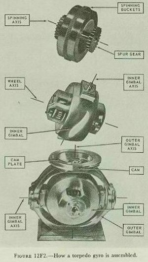 12F4. Gyro The action of a gyroscope is explained elsewhere in this text. The gyro has two properties that make it useful in ordnance devices. The property of precession is used in the lead-computing sight. The property of rigidity in space is used in the torpedo. Throughout the torpedo run, the axis of the spinning gyro remains rigid in space; that is, it points constantly in the same direction. If the torpedo turns off its proper course, it must turn with respect to the gyro axis, which remains fixed. The pallet mechanism detects this relative turning, and sends the necessary corrective orders to the steering engine. Figure 12F2 shows how a torpedo gyro is assembled in its gimbals. The gyro wheel alone is shown at the top of the illustration. Most of its weight is concentrated in its outer rim, to increase its gyroscopic action. Throughout the torpedo run, low-pressure air from the gyro reducer strikes the spinning buckets on the outer rim of the wheel, to maintain the original rate of spin. A spur gear is mounted on each end of the gyro wheel axis. One of these is engaged by a gear of the gyro spinning and unlocking mechanism, to give the wheel its initial spin. The other is present to balance the first, and to provide equal air resistance so that no unbalanced forces will be applied to the gyro. The middle picture shows the gyro wheel mounted in its inner gimbal. The wheel is free to rotate on its bearings within the inner gimbal. Note that parts of the inner gimbal are cut away to expose the two spur gears. The lower picture shows the gyro and gimbals completely assembled. (Note that in each of the three pictures the gyro wheel is shown in a different position.) In the torpedo, the gyro spins on a fore-and-aft horizontal axis within the inner gimbal. The inner gimbal itself is free to rotate on a horizontal axis at right angles to that of the gyro wheel, on bearings in the outer gimbal. The outer gimbal is free to rotate on a vertical axis, in bearings mounted in the top and bottom plates of the gyro pot. Thus the gyro wheel, with three degrees of freedom, is free to turn in any direction with respect to the torpedo. Or, more precisely, the torpedo is free to turn in any direction without disturbing the gyro axis. |