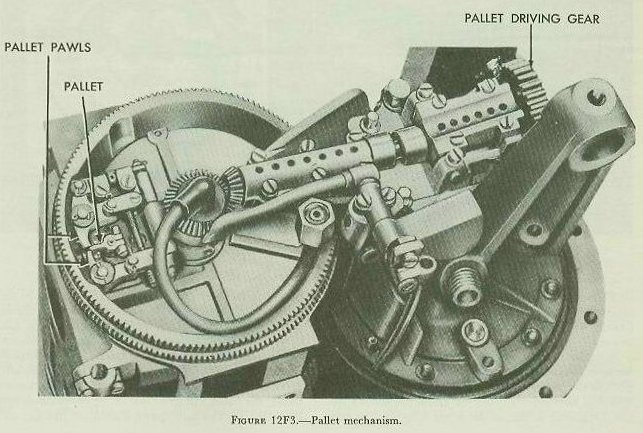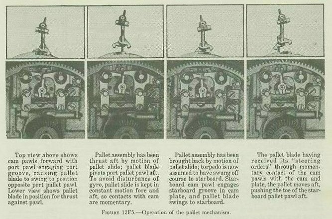 12F6. Pallet mechanism Figure 12F3 shows the pallet mechanism of a Mark 15 torpedo, mounted on the gyro top plate. The pallet driving gear is turned by a spur gear on the forward (outer) propeller shaft. Its rotation is transmitted to the bevel gear in the center of the gyro top plate. Figure 12F4 is a diagram of the whole steering mechanism. (The mechanism shown is actually that of a Mark 13 torpedo. It differs from the Mark 15 in a few details of the linkage between the pallet mechanism and the steering engine. This difference may be seen by comparing figure 12F4 with 12F3. The pallet mechanisms, and the principles of operation, are the same.) On the shaft of the eccentric gear (figure 12F4) is a cam that passes through an opening in the eccentric plate. Rotation of the cam gives a fore-and-aft motion to the plate, and to the pallet shaft holder attached to it. The pallet shaft is free to turn within its holder, but must move fore-and-aft with it. Thus the pallet shaft and its pallet (at the top) and its two cam pawls (at the bottom) have a continual fore-and-aft motion throughout the torpedo run. If the pallet (figure 12F4) is on dead center during its motion aft, it will pass between the two pallet pawls. But if the pallet shaft has been rotated in either direction, the pallet will strike one of the pallet pawls and throw it aft. The two pawls are so linked that when one of them is thrown aft, the other is automatically thrown forward. At the same time, the linkage will move the valve of the steering engine in or out. Note the cam on the after edge of the cam plate. Because the cam plate is rigidly attached to the outer gimbal, the position of the cam indicates the desired course of the torpedo. On the starboard side of the cam, a groove is cut in the lower edge of the cam plate; on the port side, a similar groove is cut in the upper edge. If the torpedo is exactly on course during the forward stroke of the pallet shaft, the two cam pawls will straddle the cam and enter the grooves. The pallet shaft will not be rotated. If the torpedo is off course, one of the cam pawls will strike the cam, rotating the pallet shaft. Then, on the next backward stroke, the pallet will strike one of the pallet pawls and throw it aft. The pallet pawl, through its linkage, will move the valve of the steering engine. The action of the pallet mechanism is shown in detail in figure 12F5. |