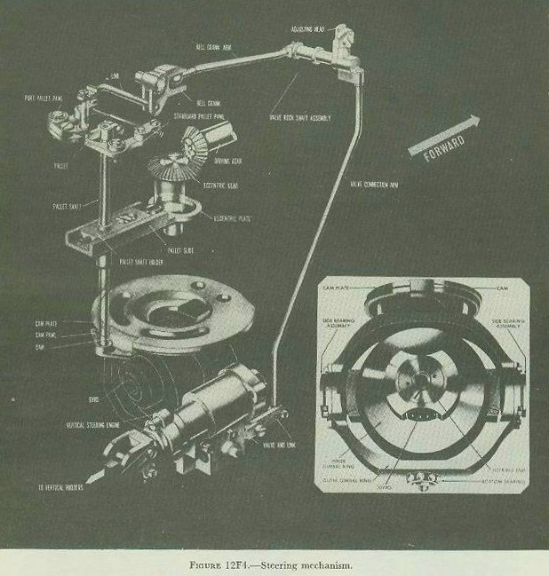 F. Control Systems of a Mark 15 Torpedo 12F1. General The torpedo is provided with 2 pairs of rudders-1 horizontal and 1 vertical. The vertical rudders control the steering of the torpedo to left or right, and keep it on its preset course. The horizontal rudders steer the torpedo up or down, to keep it at its preset depth. The 2 control systems-1 for steering and 1 for depth-are located in the afterbody. The steering system consists of a gyro, a pallet mechanism, and a steering engine. The depth system consists of a diaphragm, pendulum, and depth engine. Each of the two engines operates a rod that extends aft through a packing in the after bulkhead of the afterbody. Each of the two rods is connected to its pair of rudders through a semicircular yoke. 12F2. Functional description The control mechanisms have been called the “brains” of the torpedo. The steering mechanism turns the torpedo to its preset course, and keeps it there. If the torpedo wanders off course to left or right, the steering mechanism throws the vertical steering rudders to correct the error. And the depth mechanism brings the torpedo to its preset depth and keeps it there. If it starts to rise too high in the water, or sink too low, the depth mechanism throws the horizontal rudders to bring the torpedo back to its proper depth. Each of the 2 control mechanisms consists of 3 parts: a sensing part, a detecting part, and an engine. Sensing part. In the steering mechanism, the sensing part is the gyroscope. There is no way to keep the torpedo on course unless some part of the mechanism always points in the same direction-regardless of which way the torpedo may turn. Throughout the torpedo run, the axis of the gyro always points in the same direction. The depth mechanism has two sensing parts-a diaphragm and a pendulum. To keep the torpedo at the proper depth the mechanism must include a part that can measure how deep the torpedo is in the water. The diaphragm does that job. The pendulum is sensitive to the “running attitude” of the torpedo. Since the pendulum tends to hang straight down, it can tell if the torpedo is tilted up or down, or if it is running level. Detecting part. In the steering mechanism, the detecting part is the pallet mechanism. Assume that a torpedo has been fired with zero gyro angle. Then the axis of the gyro lies along the desired course of the torpedo, and it will point out the proper course throughout the run. If the torpedo turns to the left or right from its course, the pallet mechanism will detect the difference and send correcting orders to the steering engine. In the depth mechanism, the diaphragm and pendulum are linked together. Through this linkage they work together to send corrective signals to the depth engine. Engines. The steering engine, when it gets an order from the pallet mechanism, throws the vertical steering rudders in the direction required to bring the torpedo back on course. When the depth engine gets an order from the diaphragm and pendulum linkage, it moves the horizontal depth rudders in the direction required to bring the torpedo back to its preset depth. Both engines are powered by working-pressure air. The two control mechanisms provide only enough energy to actuate the controls of the engines. Compressed air, rather than the gyro or diaphragm and pendulum, does the work of turning the rudders. |