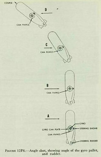 Assume that the torpedo has turned off course to port. The gyro axis and cam are still pointing in the original direction; the torpedo has turned to port with respect to the gyro axis and cam. Because the pallet shaft is abaft the cam plate, it has moved to the starboard side of the cam. When the pallet shaft moves forward, the port cam pawl will strike the cam. The pallet shaft will turn counterclockwise (looking down from the top). The pallet blade will swing to starboard. When the pallet shaft moves aft, the pallet will strike the starboard pallet pawl and throw it aft. The linkage will move the port pallet pawl forward, and it will move the steering engine valve aft. The steering engine is so designed that when its valve is moved in one direction, its piston moves full-throw in the opposite direction. The piston will therefore move forward, carrying the piston fork and rudder rod with it. The rudder rod, through its yoke, will apply right rudder. The rudder will turn the torpedo back onto its course. Actually, the torpedo will not stop turning when it comes back on course. It will swing off course on the other side. The rudder will stay where it is until the steering engine gets the opposite order. And there will be no new order to the engine until the torpedo has crossed its course, so that the other cam pawl can strike the cam. Therefore, the track of the torpedo is not a straight line. The rudder oscillates constantly, and the torpedo weaves back and forth across its course. But because the pallet mechanism is sensitive, the weaving is small; the actual track is very close to a straight line. Summary. The pallet mechanism is driven by power taken from the forward propeller shaft. A part of the pallet mechanism makes a light, intermittent contact with the cam plate of the gyro. If the torpedo has turned off course, the mechanism will detect a change in the relative position of the cam plate. Then, through a mechanical linkage, it will send an appropriate order to the steering engine valve. The steering engine will respond by throwing the rudders in the direction necessary to bring the torpedo back on course. 12F7. Angle fire In the foregoing discussion, it has been assumed that the pallet shaft is always in line with the gyro axis, and that the pallet slide moves forward and aft. But those conditions exist only when the torpedo is fired with zero gyro angle. It is often inconvenient or impossible to launch a torpedo in the direction required by the solution to the torpedo fire control problem. This is especially true with fixed tubes. In such situations angle fire is used. The steering mechanism is set so that the torpedo, after it enters the water, will turn through the angle necessary to bring it onto its proper course. For an angle shot, the gyro angle is set through one of the gyro setting sockets on the outside of the torpedo. The socket, through a gear train, turns the gyro top plate through the desired gyro angle. (But note carefully that it does not move the gyro.) The top plate carries the whole pallet mechanism around with it. Since an eccentric cam drives the pallet slide, the slide will still have its back-and-forth motion in the new position. That motion will no longer be fore-and-aft, but it will still be toward and away from the center of the gyro top plate. |