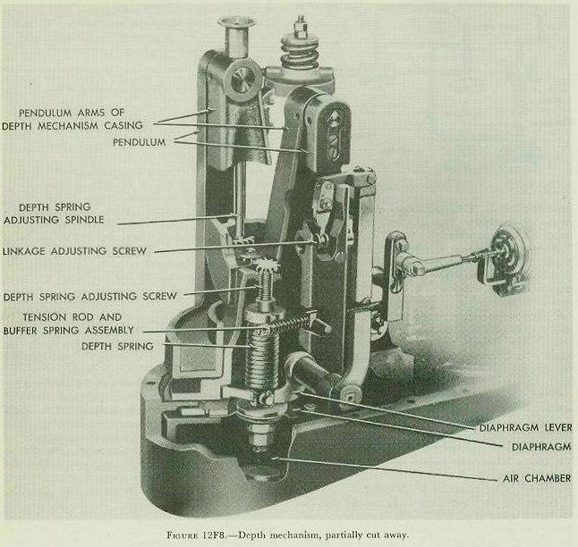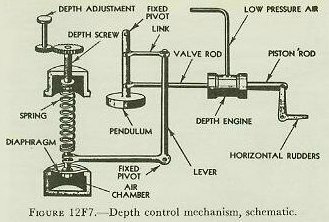 Figure 12F7 shows schematically how the diaphragm and pendulum work together. Under the diaphragm is a sealed chamber of air. Sea water reaches the upper surface of the diaphragm through suitable passages, and tends to push it down. The spring, being under tension, resists this downward pressure. (The depth at which the torpedo will run is set by adjusting the tension of this spring.) To see how the mechanism works, assume that the torpedo is below its set depth, with its axis horizontal. Water pressure pushes the diaphragm down, against the force of the spring and the resistance of the air trapped in the chamber. The downward movement of the diaphragm rocks the diaphragm lever counterclockwise. Since the diaphragm has only a limited movement, the lever is pivoted near the diaphragm, so that it multiplies the diaphragm movement by a factor of 18. |