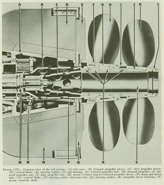12G2. Construction Figure 12G1 is a cutaway view of the tail section. A bearing in the after bulkhead of the afterbody supports the after end of the forward propeller shaft. The after propeller shaft turns, in a bronze bushing, inside the forward propeller shaft. The forward propeller sleeve (B in figure 12G1) is keyed to the forward propeller shaft and secured to it by screws. The after propeller sleeve (C) is secured to the after propeller shaft in the same way. The forward propeller sleeve turns in the tail bearing (F). The after propeller sleeve turns in four bronze bushings (R) inside the forward sleeve. The grease reservoir shell (S) holds a supply of grease inside the after propeller sleeve. When the torpedo is under way, the hot exhaust gases melt the grease in the reservoir. Centrifugal force pushes the melted grease through small passages in the propeller sleeves, to lubricate the bushings (R) and the tail bearing (F). The forward propeller hub (G) is keyed to the forward propeller sleeve. The forward propeller nut screws onto the sleeve to hold the propeller in place. Locking screws keep the nut from working loose. Half of each locking screw is in the nut, and half in the propeller. The after propeller hub (J) is an integral part of the after propeller sleeve. Except for that, the mounting of the after propeller is the same as that of the forward propeller. Each of the 2 propellers has 4 blades. The exhaust gases pass through openings in the after bulkhead of the afterbody, and enter the tail through exhaust valves. (One of these valves is visible in figure 12G1.) Springs in the exhaust valves hold them shut, except when the pressure of exhaust gases forces them open. The exhaust valves thus keep water out of the afterbody at the end of an exercise run, and when the torpedo is in the flooded tube of a submarine. When the torpedo starts, pressure builds up in the exhaust tubes and pushes the valves open. The exhaust gases then flow into the tail, into the propeller sleeves through the holes in their forward ends, and out to the sea. The four tail blades are riveted to projections on the outside of the tail cone. They stabilize the torpedo as it travels through the water. The two pairs of rudders are mounted at the after edges of the tail blades. Each rudder turns in an inner bearing on the tail cone, and an outer bearing screwed to the tail blade. These outer bearings have a double purpose. Their outer edges serve as bearing surfaces to guide the tail as the torpedo slides through the torpedo tube. |