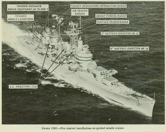 15B2. Fire control systems The exact composition and arrangement of a ships fire control system depends upon such factors as the type of ship and the size, number, purpose, and effective range of its guns. In general, fire control systems have the following characteristics: 1. The primary method of fire is director fire. When the number and arrangement of guns in a battery permits, the battery may be controlled from one station, or the fire may be divided and controlled from several points against multiple targets. 2. Provision is made for observations to establish present target position and to spot the fall of shot. 3. Computers figure the predicted position of the target, the ballistic corrections, and corrections to compensate for roll and pitch of the ship. These data are used to compute gun orders in train and elevation which are transmitted to the guns. 4. Gun orders keep the guns constantly positioned in space, ready to fire whenever the firing key is closed. 5. Provision is made for stand-by methods of control if the primary method is inoperative. 6. Efficient communications are provided, with duplicate systems for transmitting information. 7. Provision is made for control of the battery at night, including the control of star shells and searchlights. 15B3. Battleship systems On a modern battleship, the two primary main-battery directors are the highest on the ship, the forward one being about 120 feet above the waterline, the after one about 75 feet. Either director, together with equipment in the plotting rooms, can control all or part of the main battery. Also, any one of the four secondary-battery directors can be used to control all or part of the main battery. In addition, equipment in each turret permits individual, but less effective, control of the turrets independently of the directors and plotting rooms. Five optical rangefinders, one in each main-battery director and in each turret,* provide main-battery ranges. Fire control radars in the fire control tower and in each main-battery director provide radar range (and bearing) for the main battery. Below the waterline are the forward and after plotting rooms, each of which contains rangekeepers, stable verticals, graphic rangekeeping devices, switchboards, and other instruments. Information is received in plot from the radars, rangefinders, and directors, and is combined with other information obtained from various sources. Computed quantities are transmitted to the guns for their control. Either plotting room may control any part of the battery. Auxiliary computing equipment is provided in each of the three turrets, so that each may fire independently. The secondary battery has four directors, each of which has its own rangefinder and radar, and may control all or any part of the dual-purpose battery. There are two secondary (dual-purpose) battery plotting rooms similar to those of the main battery, except that they contain no graphic plotting devices. Each is equipped with two computers, two stable elements, the necessary indicating instruments, and switching equipment. With director. controlled fire it is possible to engage four secondary battery targets simultaneously with independent illumination control. The heavy machine-gun battery is equipped with a separate director and fire control system for each of its mounts. Many of the directors are equipped with radar. Decentralized control permits firing at many targets at once, and facilitates target acquisition. Flexibility of control is provided by cross connections permitting the heavy machine-gun directors to control the adjacent dual-purpose mounts, and the secondary-battery directors to control the heavy machine-gun mounts. The light machine guns (20-mm) are equipped with individual lead-computing sights. 15B4. Cruiser and destroyer systems Cruisers have fire control installations similar to those of battleships, except that there are only two directors for the dual-purpose battery (i.e., the secondary battery on cruisers with turrets; the main battery on AA cruisers). Figure 15B1shows the fire control installations on a guided missile cruiser, NOTE: Radar has replaced the optical rangefinders in the turrets of some of the later cruisers. U.S.S. Boston (CAG-l). On guided missile cruisers of this class, the after 8-inch triple turret and the after 5-inch twin gun mount have been replaced by two twin Terrier missile launchers. Destroyers have only one director and one plotting room for the dual-purpose (main) battery. The control of dual-purpose and machine-gun batteries on cruisers and destroyers is similar to that on battleships, but they can engage a smaller number of targets simultaneously, because of the smaller number of guns and directors. 15B5. The fire control problem The principal subject of the next several chapters is the fire control problem. This term has come to mean the entire series of measurements and computations used in the control of weapons, beginning with the designation of the target and the type of fire, and ending with the destruction of the target. For all batteries, the problem of gun fire control is solved in five steps: 1. Establishing the present position of the target. The first step in the solution of the problem is to establish the present position of the target with relation to the ship by measuring its range, bearing, and, for air targets, elevation. 2. Computing lead angles. Lead angles in elevation (called sight angle) and in bearing (called sight deflection) are computed to allow for wind, gun ballistics, and relative motion of own ship and target during the time of flight of the projectile. This is the principal function of all rangekeepers and computers. 3. Correcting for motion of gun platform. Corrections are computed to counteract the effect of the constant rolling and pitching of the ship. 4. Making up gun orders. Since the guns are so mounted that they can move only in train and elevation, all the foregoing information