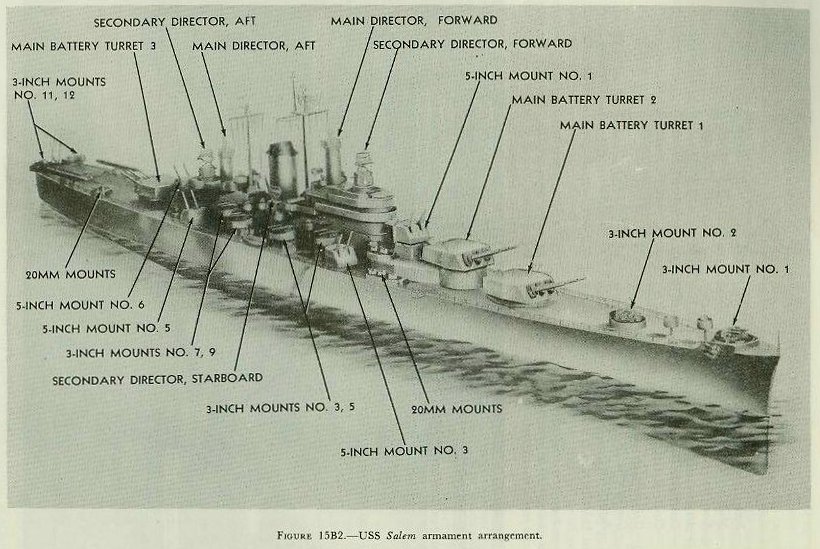 B. Modern Fire Control Systems 15B1. Batteries For a long period, the batteries of a single ship frequently consisted of guns of various sizes. Because of the difficulty of controlling and spotting the fire of so many batteries, the practice of using guns of the same size and ballistic characteristics in a given battery was adopted. This practice also resulted in a simplified system of supply for ammunition and replacement parts. The size and number of guns in a battery depends upon the type of ship. Batteries are generally referred to as: Main battery. The guns of the largest caliber aboard a ship. The term is sometimes extended to indicate the weapon of greatest potential effect. For example, the main battery of an aircraft carrier is its planes; of a submarine, its torpedoes; of certain landing craft, the rocket battery. Dual-purpose battery. Guns which are adaptable for use against either aircraft or surface targets. In ships which have a single-purpose main battery, the dual-purpose battery may be called the secondary battery. Many other ships have a dual-purpose main battery. Machine-gun battery. Permanently emplaced automatic weapons of all calibers, used chiefly against aircraft. Some typical examples of combatant ship gun batteries are shown in Figures 15B1 and 15B2. |