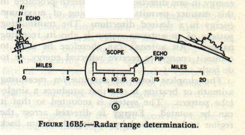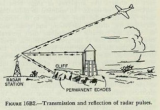 B. Principles of Radar 16B1. Definition The word RADAR is formed as an abbreviation for Radio Detection And Ranging. It is an electronic device that may be used to detect the presence of objects like airplanes or ships even in darkness, fog, or storm. In addition to indicating their presence, radar may be used to determine their bearing, distance, elevation, and speed; and to enable the operator to recognize their general character. It is one of the greatest scientific developments that has emerged from World War II. Its development, like that of most great inventions, was mothered by necessity, that of detecting the enemy before he detected us. The basic principles upon which its functioning depends are relatively simple, and the seemingly complicated series of electrical events encountered in radar can be resolved into a logical series of functions which, taken individually, may be identified and understood. 16B2. Sound-wave reflection The principle upon which radar operates is very similar to the principles of sound echoes or wave reflection. If a person shouts in the direction of a cliff, or some other sound-reflecting surface, he hears his shout “return” from the direction of the cliff. What actually takes place is that the sound waves, generated by the shout, travel through the air until they strike the cliff. There they are reflected or “bounced off,” and some are returned to the originating spot, where the person is then able to hear the echo. Some time elapses between the instant the sound originates and the time when the echo is heard because sound waves travel through air at approximately 1,100 feet per second. The farther the person is from the cliff, the longer this time interval will be. If a person is 2,200 feet from the cliff when he shouts, about 4 seconds elapse before he hears the echo, that is, 2 seconds for the sound waves to reach the cliff and 2 seconds for them to return. |