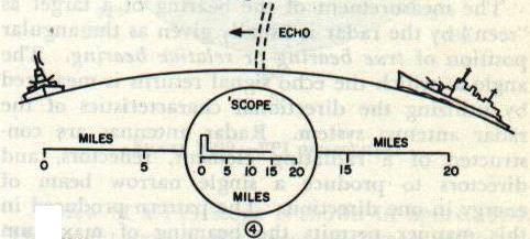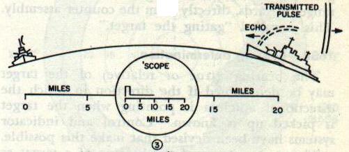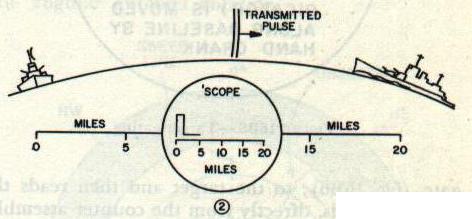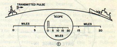 16B6. Types of presentation To furnish usable intelligence, a radar set must have some type of visual presentation of the target echo for the operator to observe. Cathode-ray tubes are used for this purpose. The cathode-ray tube is a special type of vacuum tube which acts as an electronic stop watch. As shown in figure 16B3, electrons are channeled into a narrow beam by an electron gun in the neck of the tube. The electrons shoot out of the small hole at the right-hand end of the gun and hit the fluorescent screen on the large end of the tube, which glows at the point where the electrons strike. Between the gun and the screen, the electron beam passes between vertical deflection plates and horizontal deflection plates. If a variable voltage Is applied to the horizontal plates, the beam can be made to sweep back and forth in a horizontal line. If a voltage is applied to the vertical plates, the beam can be made to deflect in a vertical direction. If a voltage to the vertical plates is used in conjunction with the voltage to the horizontal plates, a horizontal line deflected upward at certain points can be produced. Type-A presentation is used to determine range, and the scope has short persistence (a target indication remains on the scope face only instantaneously). The echo causes a vertical displacement of the spot. The amplitude of the displacement depends on the strength of the returned signal pulse. The point on the horizontal base line at which the vertical displacement occurs indicates the range. Type-A presentation is shown in figure 16B4A. The Type-B presentation (fig. 16B4B) indicates both range and azimuth angle. The vertical displacement of the echo signal indicates range, and the horizontal displacement of the echo signal indicates azimuth angle. This scope has medium to long persistence. Type PPI (plan position indicator) presentation, shown in figure I6B4C, also indicates range and azimuth angle. In this type of presentation the electron beam is swept radially from the center of the scope to the outer edge. The sweep line follows the antenna rotation. In effect, a picture of surrounding objects is painted” on the screen. This scope has medium persistence. 16B7. Range determination The successful employment of pulse-modulated radar systems depends primarily on the ability to measure distance in terms of time and on a knowledge of the velocity of light. Radio-frequency energy, once it has been radiated into space, continues to travel with a constant velocity. When it strikes a reflecting object there is no loss of time, but merely a redirecting of a portion of the energy. Its velocity at the speed of light is 328 yards per microsecond. This means that it takes approximately 6.1 microseconds of radio energy to travel one nautical mile which is approximately 2,000 yards. All radar ranging is based on a flat figure of 2,000 yards per mile, and, because the speed of light (and radio waves) is so great, microseconds (ps) are used for all time determinations. This constant velocity of r-f energy is applied in radar to determine range by measuring the time required for a pulse to travel to a target and back. The time lapse between the transmitted pulse and the echo return may be readily determined with the aid of the scope. For the purpose of illustrating how this is done, assume that a target ship is 20 nautical miles away from the radar set. Because radio energy travels 1 nautical mile in 6.1 microseconds, 122 microseconds will be required for the transmitted pulse to reach the target, or a total of 244 microseconds will elapse before the echo will return to the radar receiver. To measure this time, the horizontal sweep frequency of the scope is adjusted so that it makes one complete sweep (from left to right) during the time the transmitted pulse is going to the target and the echo is returning to the receiver. Figure l6B5 shows how the range is then determined. In 16B5-1 the transmitted pulse is just leaving the antenna. A part of the generated energy is fed to the vertical deflection section of the scope tube at the instant the pulse is transmitted and causes a vertical line (pip) to appear at the zero-mile mark on the scope. In 16B5-2, 61 microseconds later, the transmitted pulse has traveled 10 miles toward the target. The horizontal trace on the scope, however, has reached only the 5-mile mark, that is, one half the distance the transmitted pulse has traveled. In figure 16B5-3, 122 microseconds after start, the transmitted pulse has reached the target 20 miles away and the echo has started back. Scope now reads 10 miles. In figure 16B5-4, 183 microseconds after start of initial pulse, the echo has returned half the distance from the target, and the scope reading is 15 miles. In 16B5-5, 244 microseconds after the initial pulse, the echo has returned to the receiver. An echo pip, of smaller amplitude than the initial transmitter pip, is displayed on the scope at the 20-mile mark. If two or more targets are in the path of the transmitted pulse, each will return a portion of the incident energy as echoes. The target farthest away (assuming they are similar in size and type of material) will return the weaker echo. The foregoing are the basic principles of all ranging scope determinations. Usually in conjunction with the scope there is a hand crank and mechanical counter assembly. When a target is indicated on the base line, the operator turns the hand crank to move the range indicator, or gate (fig. 16B6), to the target and then reads the range, in yards, directly from the counter assembly. This is called “gating the target.” 16B8. Bearing determination The bearing (true or relative) of the target may be determined if the direction in which the directional antenna is pointing when the target is picked up is known. Control and indicator systems have been devised that make this possible. The measurement of the bearing of a target as “seen” by the radar is usually given a