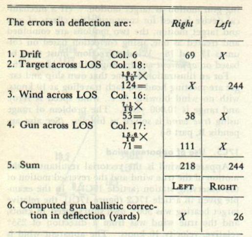 The example given in article 17C2 will be continued to find the gun ballistic for that situation, with further variations due to powder temperature 80 degrees F., velocity loss due to erosion 18 foot-seconds (below 2,500 foot-seconds), and atmospheric density corresponding to surface air temperature 52° F. and barometer 30” .40. The multiplier for column 12 (variation in air density) is found by first obtaining from the aerological party a value of ballistic density factor, in this case 1.043. - 1.043 = -043 = (-) 4.3% Since column 12 is based on a 10 percent variation, the multiplier is (-)4.3/10, or (-) 0.43. The minus sign indicates that the range error will be short. The powder temperature is 10° less than standard, causing a velocity loss of 2X10=20 foot-seconds. The six range elements will be summarized: (See also appendix B, part 6.) Note the arrangement of column headings. Item 7 shows the sums of the over and short errors. Item 8 shows the algebraic sum of these errors (452-84=368), tabulated in the same column as the larger of the two. However, between items 7 and 8 the column headings are changed, so that the computed gun ballistic correction may be read as it will be used. Obviously a summation of range errors which is 368 yards short will require a correction of ADD 368 yards. The errors in deflection will now be summarized and the gun ballistic in deflection obtained. Note the change in column headings between lines 5 and 6. (See also appendix B, part 6.) The algebraic sum of the errors is 26 yards to the left. The shift in the column headings allows the computed gun ballistic correction to be read directly as right 26 yards. Caution must be exercised in reading the direction of the correction as shown directly above line 6, and not at the top of the column. As a last step, it is necessary to convert the ballistic correction in deflection from yards to mils. This is accomplished by dividing the correction in yards by the range in thousands of yards (26 divided by 10). Thus, in the example, the correction is right 0-3, which is the whole number of mils closest to 2.6. 17C4. Motion of own ship In the headings of range-table columns 13 and 16, neither true wind nor apparent wind is specified. If the gun were fired in a vacuum, the additional horizontal velocity imparted to the projectile by the motion of own ship would be equal in effect to equivalent target motion. However, the gun is fired in air, which for purposes of this discussion is assumed to be motionless. Now, the movement of own ship through this still air creates a wind apparent to a person on the ship. This apparent motion of the wind is equal in speed but opposite in direction to ship motion. Its effect is partially to nullify the extra velocity imparted by own ship, for it acts on the projectile just as though it were an actual wind. Thus, the effect of a component of own-ship motion (column 14 of range table) is numerically equivalent to the effect of an equal component of target motion (column 15 of range table) less the effect of an equal component of wind (column 13 of range table), as was pointed out in article 17B10. If true wind is used, gun motion, from columns 11 and 17, will include the effect of the wind set up by own-ship motion (column l4=column 15-column 13, and column l7=column 18-column 16). However, apparent wind, by definition, includes the effect of the wind set up by own ship’s motion. Therefore, if apparent wind is used, the use of columns 14 and 17 for gun motion would then result in correcting for this wind effect twice. Therefore, when apparent wind is used, gun motion is the numerical equivalent of target motion, since wind set up by own ship’s motion is incorporated in the apparent wind, and errors due to gun motion must be calculated using columns 15 for range and 18 for deflection. This is referred to as “treating gun motion as target motion.” (If a mechanical device is used for computing the effects of gun and target motion, the two motions are combined and treated as one, using correction based on columns 15 and 18. Wind corrections must then be based on apparent wind, using columns 13 and 16.) For an illustration assume that own ship and target are meeting head-on, each traveling at 10 knots, with no wind blowing (i. e., wind speed is zero), and range is 10,000 yards. The problem of range using true wind is solved as follows: (See also appendix B, part 6.) 17C5. Use of apparent wind Apparent wind is the vectorial resultant of the motion of the true wind and the reversed motion of the observing station (article 17C1). In the example given in article 17C2 (figure l7Cl), the relative target bearing was 300°, own ship’s speed 18 knots, and the true wind was from a direction of 255° relative, velocity 10 knots. The apparent wind is determined vectorially as illustrated in figure 17C2. |