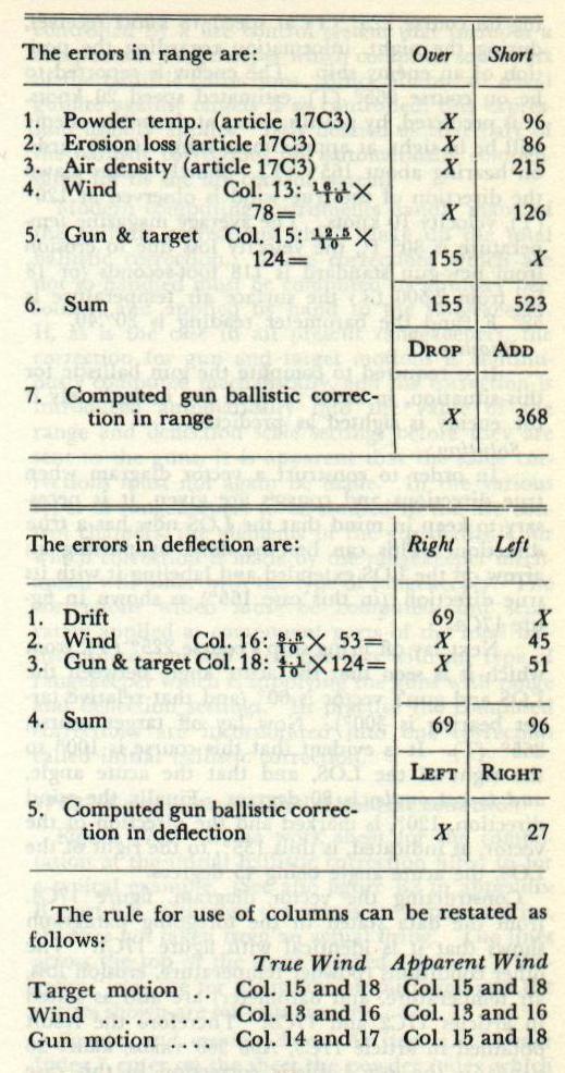 17C8. Computation of Initial ballistic correction Figure 17C5 is the work sheet for the computation of the initial ballistic correction filled in for a typical example. (See also figure B2 in appendix B, part 6.) Although the values are representative, they are not taken from an actual firing. The lines across the top of the sheet marked “Battery,” “Exercise,” etc., are for identification purposes, and the entries shown are self-explanatory. Powder and erosion data. As item a, “Powder Index,” enter on the sheet the powder index which appears on the powder card, thus identifying the powder used. Item b is "I. V. Erosion Data.” Enter the initial velocity which is used as the basis from which velocity loss is computed. Its value may be found from the erosion-data section of the applicable range table. (It should be noted that this entry may not be the same as the I. V. for which the range table was prepared. See art. l7B4.) Item c is “Average Powder Temperature.” Enter the average temperature of the magazine from which the powder is drawn. Item d, “Temperature Coefficient,” is the number of foot-seconds change of I. V. for each 1 degree F. change of powder temperature. It will be considered as 2 foot-seconds for the example given (see art. l7B4). If more accurate information on temperature coefficient is to be used, it will be found in OP 1004, which is carried in the gunnery department library of the ship. Space is provided in item e for entering erosion data for the individual guns to be fired. (In the example given, one gun of each twin mount in a destroyer main battery is considered.) Entries are made for the gun numbers, (guns in multiple mounts are usually numbered with the mount number plus the letters, L, R, or C to indicate the position of the guns) the “pseudo equivalent service round,” and bore enlargement or erosion-gage readings. note: The forms reproduced in figures 17C5 and 17D1, 2. and 3 are marked CONFIDENTIAL when filled in with data pertaining to an actual gunnery practice, and must be so treated. In this case, however, the data used are purely hypothetical. A review of chapter 5, section D, which discusses the manner of correcting I. V. loss due to erosion is required at this time, as is an understanding of the term “pseudo equivalent service round (PESR).” An equivalent service round has been previously defined as one which produces an amount of bore enlargement equal to that caused by a full-charge standard round. (Thus several reduced charges make up an equivalent service round) The PESR is the number of equivalent service rounds corresponding to the last accurate measurement of bore enlargement. When a gun is fired for the first time after star gaging, the PESR is not needed, since I. V. loss value may be obtained directly from the curve of I. V. loss against bore enlargement. Suppose, however, that several firings have taken place since bore gaging. In this event the number of equivalent service rounds which have been fired since the last bore gaging are determined. This number of equivalent service rounds is then added to the PESR. With this total of service rounds a corresponding bore enlargement is picked off the ESR-bore-enlargement curve, and from this value the total I. V. loss may be obtained as before from the bore-enlargement curve. If the temperatures of the various magazines from which the powder for individual guns is taken vary more than 2° F. from one another, entries should be made under the heading “Powder Temp. Corr.” and the I. V. loss due to this effect combined with the I. V. loss due to bore enlargement. If this is done, line 1 shown on the sheet must be left blank. In this example it is considered that the magazine temperature of all the magazines is 80°, and therefore the entry under “Powder Temp. Corr.,” item e, is zero, all loss of I. V. due to variation in powder temperature being accounted for under item 1 (i. e 20 f. s.). The important point to remember is that the effect of variation in I. V. due to change in powder temperature should not be corrected for twice. Since the entry under “Powder Temp. Corr.” in the example is zero, the entries under column marked “I. V. loss F. S.” will be the I. V. loss for each gun due only to bore enlargement, or 32, 34, and 35 foot-seconds respectively. In 5”/38 caliber guns, erosion connectors are not provided at the individual guns. This means that an average I. V. loss (34 f. s. in this instance) will be used in line 2, and the notation “None provided” will be made under the heading “Erosion Corrector Setting, F. S.” (If, however, as is the case in main-battery guns, individual erosion correctors are provided at the guns and compensation for gun erosion is made both at the guns and in the rangekeeper, the column marked “Erosion Corrector Setting, F. S.” would have the entry zero opposite the least eroded gun of the battery. Entries for the other guns would be the velocity loss in excess of that for the least eroded gun.) Atmospheric conditions. Item f is the barometer reading in inches, and item g is the temperature in degrees Fahrenheit. Both are surface readings taken from the ship’s instruments. Item h, “Ballistic Density,” is to be left blank unless it has been determined from actual measured data aloft or from an estimate made by an experienced aerologist. Trunnion and curvature data. It has been brought out that the angle of elevation to be set on a gun is normally applied from the LOS. When the target cannot be seen and no LOS is available (which often happens during shore bombardment), the angle of elevation is applied above the horizontal plane. This use of the horizontal plane gives rise to two additional errors at long ranges in surface fire, those caused by (1) the earth’s curvature and (2) trunnion height. Although the solution is correct for a target which lies in the horizontal plane tangent to the earth at own ship