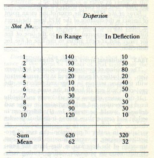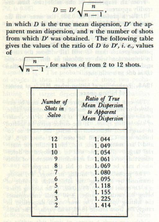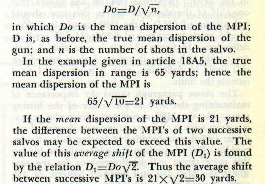 18A9. Spotting MPI to center of hitting space The two cases illustrated in figures 18A1 and 18A3 will be analyzed to see what information may be obtained of interest to a spotter on shipboard. In the first case, with the MPI at the center of the hitting space, the laws of probability show that about four hits (i. e., 0.379X10) in range should be obtained in a 10-shot salvo. Therefore, about six shots will miss the target; and since the first consideration of the normal law states that positive and negative errors will occur with equal frequency, it follows that about three [(10-3.79)÷2] of these misses will be “shorts.” Probably the most common fault of spotters is the feeling that shorts are wasted, since it is so readily apparent that they have not hit the target, and that ensuing salvos must be spotted up until no shorts are seen. Consideration of relative sizes of pattern and hitting space will show, however, that if the MPI is to be anywhere in the hitting space, some shots must be observed short of the material target, even with the symmetrical shot distribution assumed in this discussion. Again, remembering that the greatest density of impacts is grouped within a relatively short distance of the MPI (±0.846D), it is obvious that if no shorts are seen the MPI must be well beyond the center of the hitting space and, at any likely range, well outside the hitting space. Thus the greater part of the salvo, and particularly the densest portion of the salvo, is actually being wasted. Also, as the range increases, the hitting space decreases, the probability of hitting decreases, and the number of shorts which should be seen increases. (Of course, the converse is true; the range is finally reducing to a point where the maximum ordinate of the trajectory is less than the vertical height of the target. in this case the danger space equals the range; the range at which this condition occurs is called the danger range.) In the second case, the error of the MPI in range is one-half the pattern size. (It should be mentioned that this pattern size does not represent the pattern size of an infinite number of shots, since it was based on the points of impact of only ten shots.) The MPI is 90 yards beyond the material target and the densest portion of the salvo, included within the distance ±0.846Dr, is entirely beyond the target. The probability of hitting in range is reduced from 0.379 (for error of the MPI equal to zero) to 0.118, or by more than two-thirds. These values clearly demonstrate the necessity of spotting the MPI to the center of the hitting space, which in turn requires a considerable number of observed shorts. An officer detailed to duties which include spotting should know the probability of hitting at various ranges up to the extreme range of his battery against the various types of target which might be encountered. This information will tell him the number of shorts which should be expected or striven for under all possible conditions. 18A10. Accidental errors causing shift of MPI Another phase of the problem of interest to the spotter is a knowledge of the amount which the MPI’s of successive salvos may be expected to vary in location. Since the MPI is the center of the points of impact, which are the results of unpredictable accidental errors, it is logical to suppose that no two salvos will be exactly alike. Or, since successive shots from the same gun, fired under the same conditions, may be expected to vary, the MPI’s of successive salvos will also vary. The MPI of 100 shots (although fired as 10 salvos of 10 shots each) is the geometrical center of the points of impact of these 100 shots. The MPI’s of the individual salvos will differ from this aggregate MPI by varying amounts which, however, are still in accordance with the normal probability law. The distance each MPI is located from the aggregate MPI is the dispersion (in range and deflection) of that MPI. The arithmetical mean of the dispersions of several MPI’s (with respect to the aggregate MPI) is called the mean dispersion of the MPI. This value may be obtained by the equation |