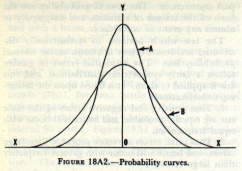 The true mean dispersion, in the above case, is found by multiplying the apparent mean dispersion by 1.054. Hence the true mean dispersion in range, denoted by Dr, is 62 X 1.054 = 65 yards, and in deflection, denoted by Dd, is 32 X 1.054 = 34 yards. 18A6. Law of probability applied to dispersion After determination of the true mean dispersion of shots fired by a battery of guns, the next step is the investigation of the manner in which the accidental errors, which resulted in this dispersion, will affect the chances of hitting a target, and how the control of a battery of these guns will be influenced by a knowledge of these errors. In this study use is made of the laws of probability, which deal with the prediction of future occurrences on the basis of information gained from past occurrences. The laws of probability are the basis of the science of statistics, and may apply to almost any event or occurrence. |