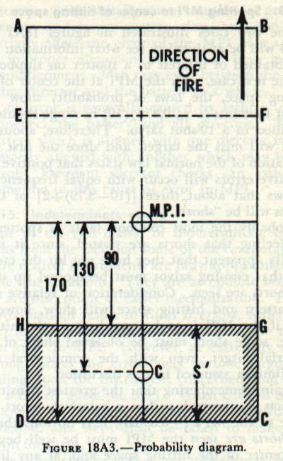 Figure 18A1 also shows that the densest portion of the salvo is centered upon and relatively close to the MPI. In article 18A7 it was shown that one-half of the shots, or five in this case, should fall within ±O.846D of the MPI, or within 0.846X65=55 yards in range and 0.846X34=29 yards in deflection. In figure 18A1 it is seen that 5 shots are within this limit in range; 4 shots are within this limit in deflection, with 2 more just 1 yard outside the limit. The above paragraph shows the importance of maintaining the MPI at the center of the hitting space. As the MPI moves away from the center, it carries with it the area of greatest density of impacts, and the probability of hitting falls off very rapidly. For comparison, the probability of hitting this same target will be determined for the case where the MPI lies just one-half pattern, or 130 yards, beyond the center of the hitting space. Referring to figure 18A3, the center of the hitting space, which is represented by the shaded area, is at C. The MPI is 130 yards beyond and in line with C. In order to find the probability of hitting within the hitting space, in range, it is necessary first to determine the probability of hitting the total area ABCD, using ±a equal to 170 yards, which is seen to be equal to the error of the MPI plus one-half the hitting space, S’. This probability is denoted by the symbol Pr1. Next the probability of hitting within the area EFGH is determined using ±a equal to 90 yards, which is equal to the error of the MPI minus one-half the hitting space, S’. This probability is denoted by Pr2. Now, if Pr2 is subtracted from Pr1 the result will be the probability of hitting within area ABCD minus EFGH, or within the two areas ABFE and HGCD. These two areas are equal, so that the probability of hitting within the single area HGCD is one-half this result, or Pr= 1/2 (Pr1 - Pr2). This problem will now be solved as explained above, first for Pr1, then for Pr2, and finally for one-half their difference. True mean dispersion in range, Dr, as before, equals 65 yards. For Pr1, ±a/Dr=170/65=2.62; and Pr1=O.963. For Pr2, ±a/Dr=90/65= 1.38; and Pr2=0.728. Then Pr=½(0.963_0.728)=0.l 18. But P=PrXPd. The value of Pd will not differ from the value found above, since the error of the MPI in deflection is zero. Hence P=0.1l8x0.981=0.l16. |