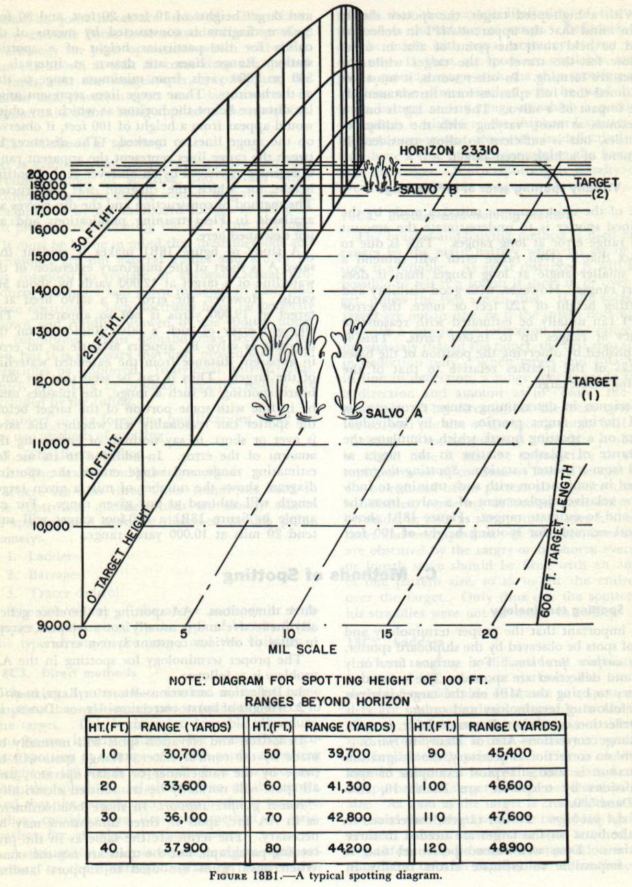 | B. The Spotter 18B1. General function of the spotter The primary function of the spotter is the correction of range and deflection errors of the MPI so as to bring the shots on the target, or, in other words, to establish the hitting gun range and deflection. The basis of these corrections is his own observation combined with those of the fire control radar operator. As a rule, in good visibility the spotter will estimate the necessary deflection correction, and range corrections will be obtained from the radar. Under unfavorable conditions both range and deflection corrections will be obtained from the radar. Prompt and accurate correction of initial errors may be the deciding factor in a naval engagement. In the event of radar failure, optical spotting must be relied upon for all corrections necessary to establish the hitting gun range and deflection. Therefore in the initial discussion of the spotter�s problems, it will be assumed that radar is not available. 18B2. Other functions and duties The spotter�s detailed duties and spotting procedures are prescribed in the ship�s battle bill and fleet doctrinal publications. Included are the following important duties: 1. Search for and locate the enemy. 2. Describe the enemy forces (number of ships, bearing, etc.). 3. Estimate all values for the initial rangekeeper set-up (enemy speed, target angle, and range). 4. Notify Plot and Control of any changes of target angle, target speed, and enemy deployment. 5. Keep Conn and Control informed of the tactical situation. 18B3. Visual estimation of target course and speed The spotter who can estimate target angle and target speed with fair accuracy will greatly assist the rangekeeper operator in arriving at an early solution of the problem, and also aid him in checking the rangekeeper set-up. On the other hand, if the spotter�s estimates are inaccurate the range-keeper operator will have to make many changes. To estimate target angle the spotter must know the structural details of all likely targets. Silhouettes and scale models of all probable targets are furnished each ship. The spotter should study the details of these visual aids, not only for the purpose of recognizing the enemy, but also for estimating target angle. In estimating target angle, the spotter should make use of prominent objects such as bridges, breaks in the deck, stacks, masts, and other features. By observing the opening and closing of the apparent distance between such details, the spotter can estimate the angle the enemy ship makes with the line of sight. Target speed can at best be only roughly estimated. Here again, knowledge of enemy ships is valuable, particularly in the case of maximum speeds. If in line of battle, target speed may be estimated as about 1 or 2 knots less than the maximum speed of the slowest ship in the formation, considering any damage reports which may have been received. The best speed estimates can be made only by men who have had extensive training and experience. The aids used by a spotter in a direct estimation of target speed are smoke from the stacks, bow wave, and stern wake. 18B4. Visually spotting error of MPI in deflection Correcting the deflection is extremely important not only for hitting but also because, in long-range surface fire, it is difficult to spot in range if the deflection error is excessive. A salvo which is widely off a target should first be spotted in deflection, and the succeeding salvo spotted in range. In estimating deflection spots, the estimated target width in mils should be used as a guide. Also, telescopes, binoculars, or other optical devices fitted with mil scales furnish a suitable means of estimating deflection errors. With a high-speed target, the spotter should bear in mind that the apparent MPI in deflection should be held abaft the point of aim in order to allow for the travel of the target while the splashes are forming. In other words, it must not be assumed that full splashes form instantaneously at the impact of a salvo. The time lag is only a few seconds at most, varying with the caliber of projectiles, but is sufficient to allow considerable movement of a high-speed target. 18B5. Visually spotting error of MPI in range One of the most common mistakes made by the untrained spotter is to underestimate the amount of the range error at long ranges. This is due to the fact that a given range error will subtend a much smaller angle at long ranges than it does at short ranges. However, with good visibility and a spotting height of 120 feet or more, the error of MPI can usually be estimated with reasonable accuracy at ranges up to 15,000 yards. This is accomplished by observing the position of the bases or slicks of the splashes relative to that of the waterline of the target. Experience in determining range error can be gained during target practice and by individual practice on a spotting board, which stimulates the appearance of splashes relative to the target as viewed from a spotter�s station. Spotting diagrams are used in conjunction with such training to indicate the relative displacement of a salvo from the target and to estimate ranges. Figure 18B1 shows a typical example for spotting height of 100 feet and target heights of 10 feet, 20 feet, and 30 feet. Such a diagram is constructed by means of dip curves for the particular height of a spotting station. Range lines are drawn at intervals of 500 or 1,000 yards, from minimum range to that of the horizon. These range lines represent angular distance below the horizon at which any object would appear from a height of 100 feet, if observed on the range lines so marked. The distances between the range lines represent the apparent range differences as viewed by an observer at the spotting height for which the diagram was constructed. The method of construction and the dip curves are available in Fleet training publications and are not described here. A study of figure l8Bl makes it evident tha