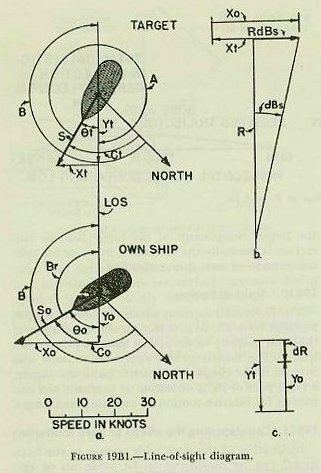 | The direction of the effect of the components on range or bearing can best be ascertained by observation. Consider the target stationary; then examine the direction of Yo and Xo. If, as in figure l9Bl, Yo causes range to increase, it is considered positive. Xo, the bearing component, is positive if, as in the figure, it causes the line of sight to move to the right (or the numerical value of bearing to increase). Then consider own ship to be motionless, and assign algebraic signs to target components by the same reasoning. In figure 19B1, by inspection, Yo and Xo are positive and Yt and Xt negative. 19B5. Range rate In figure l9Bl (c), the range components have been added algebraically to form the range rate. Since Yt is greater than Yo and is negative, dR is negative, decreasing the range. Range rate must be converted from knots into yards per second, since range is measured in yards. The conversion constant is the result of the following equation: 1 knot =2,027 yards per hour/3,600 seconds per hour=0.563 yards per second. 19B6. Bearing rate In figure l9Bl (b), the bearing components are added to obtain the linear bearing rate RdBs. Since Xo is positive and larger, RdBs is positive (increasing). Since bearing is an angle, rate of change of bearing must be converted to an angular rate. RdBs is linear. The conversion is accomplished as follows: 1 knot = 0.563 yards per second. 1 yard per second = 1/R (yds)/1000 = 1000/R (yds) mils per second. 1 mil = 3.438 minutes of arc. 1 knot at range R (yds) = 0.563 X 1000/R (yds) X 3.438 = 1936/R (yds) minutes of arc per second. Therefore, dBs (min. of arc per sec.) = 1936 x RdBs (kts)/R (yds) |