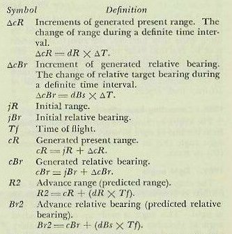 | By continuously applying the rates it is possible to keep accurate values of present range and bearing, even though measurements of range and bearing may be interrupted. And by using time of flight, it is possible to predict the position of the target at the end of the time of flight, assuming that relative motion is constant for the short time interval involved. In practice, the error resulting from the fact that RdBs is a linear instead of an angular rate is reduced in modern computing instruments by using very short time intervals in the computation. Also for obtaining each successive instantaneous value of R and Br the new values of dR and RdBs obtained for the preceding instant are used. This completes the analytical solution of the problem of maintaining continuous values of present and predicted range and bearing. It is immediately apparent that because of the time required for computation, the large number of calculations necessary, and the errors introduced by using finite time intervals, the analytical solution is of no practical value in modern gunnery. Mechanical and electrical rangekeepers and computers have been perfected which accomplish all the steps of the computation automatically on the basis of accurate basic inputs. |