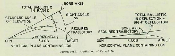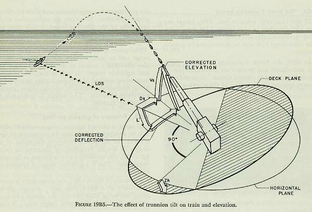 | 19B8. Computing bore offsets The angles by which the gun bore must be offset from the line of sight in order to hit the target are sight angle (Vs) in elevation and sight deflection (Ds) in train. Figure 19B2. 19B9. Sight angle The chapter on exterior ballistics presented the method of determining the vertical angle by which the bore axis of the gun must be offset from the line of sight. This angle is made up of the standard angle of elevation (column 2 of the range table), plus the angular equivalent of the total ballistic correction in range, plus the angular equivalent of range spots. In fire control, this angle is called sight angle (Vs). It should be noted that one of the largest components of the range ballistic correction is normally the correction in range for relative motion of own ship and target. 19B10. Sight deflection The horizontal angle by which the bore axis must be offset from the LOS is the angular equivalent of the total ballistic in deflection plus any deflection spots. The details of this computation were also covered in the chapter on exterior ballistics. Again, a large part of sight deflection is normally the correction for relative motion of own ship and target. 19B11. Counteracting the effects of deck inclination Inclination of the deck with respect to the horizontal can be considered to be made up of two components, one in the plane through the line of sight, the other in a plane perpendicular to this plane through the line of sight. The first is relatively easy to counteract, since it affects only gun elevation. By keeping the line of sight on the target as the deck moves, the gun axis is maintained in its proper position. The deck inclination across the line of sight is more difficult to counteract. |