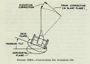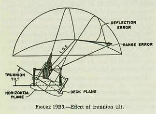 | 19B12. Trunnion tilt Inclination of the deck across the line of sight tilts the gun trunnions out of the horizontal. For the purpose of simple explanation, the entire gun mount is considered to rotate around the line of sight. Figure l9B3 illustrates the effect of this motion. As one looks along the LOS, the gun trunnions are seen to be tilted to the right, swinging the elevated gun barrel to the right. It is apparent that this will cause a deflection error to the right, if not corrected. The same movement decreases the amount the gun bore is elevated above the horizontal, introducing a range error. What actually has happened is that the sight angle and sight deflection computed for the vertical and horizontal planes respectively are now being applied in two entirely different planes; i. e., in planes perpendicular to and parallel to the deck plane, which is now inclined. To take the extreme case, a trunnion tilt of 90 degrees would result in the bore axis being offset horizontally by the amount of Vs and vertically by the amount of Ds. The deflection error resulting from trunnion tilt is normally large and in the direction of the tilt. The range error is small and almost always causes a decrease in gun range. An examination of figure 19B3 shows also that the angular displacement of the gun barrel depends upon the amount of gun elevation and the amount of trunnion tilt. 19B13. Correction for trunnion tilt Even though trunnion-tilt errors are shown in the vertical and horizontal planes, the gun is limited in its movement to training in the deck plane and elevating in a plane perpendicular to the deck. Consequently, the corrections must be calculated in the deck and perpendicular planes. As the deck is tilted, the gun barrel describes the surface of a cone the axis of which is the LOS. To return the barrel to a position parallel with its former position in space, the mount must be trained in the deck plane, which is now inclined, and elevated or depressed in a plane perpendicular to the deck. As the mount is trained, the gun barrel will follow the surface of a cone the axis of which is perpendicular to the deck. |