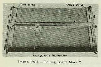| C. Graphic Rangekeeping 19C1. The Mark 2 plotting board In the analytical solution (sec. 19B), target motion and own-ship motion in the LOS were calculated mathematically and combined into range rate. The same range rate may be determined by graphic analysis. |