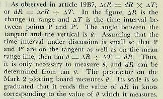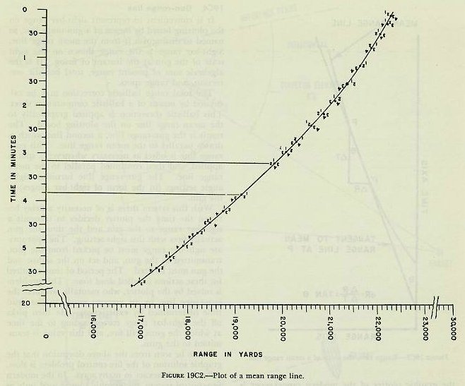 | Range rate determined in a similar manner on the graphic plotter of the modern rangekeeper is used to check the range rate generated by the range-keeper. This will be explained in chapter 20. 19C4. Gun-range line It is convenient to represent sight-bar range on the plotting board by means of a gun-range line, so named to distinguish it from the mean range line. Sight-bar range is the range shown on the sight scale of the gun at the instant of firing. It is the algebraic sum of present range, total ballistic correction, and range spots. The total range ballistic correction may be calculated by means of a ballistic computation sheet. This ballistic correction is applied graphically to the mean range line on the plotting board. The result is the gun-range line, a second line which is drawn parallel to the mean range line. This gun-range line is offset as necessary whenever a spot is applied, and then continued parallel to the mean range line. The gun-range line furnishes sight-angle settings (in the form of sight-bar ranges) to the gun. With this system there is of necessity a delay between the time the plotter decides to transmit a sight-bar range to the gun and the time the gun actually fires with this sight setting. The appropriate sight-bar range must be picked from the plot, transmitted to the gun, and set on the sights; and the gun must be fired. The period of time required for these actions is called dead time. This problem is solved by the plotter, who mentally advances the gun-range line by an amount equal to the dead time (determined by experience). He then picks off the sight-bar range corresponding to the time at which the guns will fire, and this value is transmitted to the guns. It can be seen from the above discussion that the graphic solution of the fire-control problem is slow, difficult, and inexact in many ways. In the modern fire-control system, the graphic plot is used only as a check on the range rate generated by the range-keeper. |