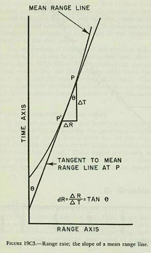 | 19C2. Principle of graphic plotting If range is plotted against time, a series of points will be developed which may be connected to form a curve. If the points represent the mean of the ranges of several rangefinding instruments (as in fig. 19C2), the resulting curve is known as the mean range line. This is a graphic means of keeping the range. Referring to figure 19C1, the range scale is moved downward at a fixed time rate. Ranges plotted along the range scale provide the points which are connected to form the mean range line. If ranging is interrupted for a short interval of time, the mean range line may be continued (or advanced) with little or no loss in accuracy. This has occurred from 3 minutes 10 seconds to 3 minutes 50 seconds in figure 19C2. 19C3. Range rate An inspection of figure 19C2 reveals that if the mean range line slopes downward to the left, as in this case, the range is decreasing. The result is a decreasing or negative range rate. Conversely, if the mean range line were sloping downward to the right, the range rate would be increasing or positive. The amount of slope at any point with respect to the time axis is a direct indication of the instant range rate at that time. More accurately stated, range rate varies directly as the tangent of the angle formed by a line tangent to the mean range line and the vertical (time axis). This is illustrated in figure 19C3. |