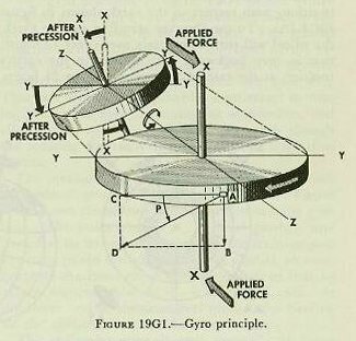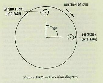 | A study of figure 19G1 will show that precession, like rigidity in space, is a result of inertia. Imagine that the larger wheel in the figure is spinning rapidly, in a direction shown by the arrow on its rim. If a force is applied that tends to move the wheel in its plane of rotation, or along its axis, no precession will result, since such forces do not tend to change the direction of this axis. But consider a force that tends to change the direction of the axis. Such a force is represented by the two arrows, marked �applied force.� If the wheel were not spinning, this force would turn the wheel about the axis Y-Y. However, since the wheel is spin-fling rapidly, it responds to the applied force by precessing-by moving its axis in a direction at 90 degrees from that of the applied force. To understand this action, consider the forces acting on the point marked �A,� at the instant represented by figure l9Gl. The inertia of this moving point tends to carry it in the direction AC. The applied force tends to move point A in the direction AB. Assume that in the diagram the lengths of these two lines, AC and AB, are proportional to the respective magnitudes of the two forces. Since the point A can not move in two directions at once, it must respond to the two forces acting on it by moving in the direction AD. The direction and length of the line AD represents the direction and magnitude of the resultant (vector sum) of the two forces acting on point A. Obviously, point A can move in the direction AD only by turning the wheel�s plane of rotation to the position shown in the smaller diagram of figure I 9G1. So far, the discussion has been confined to the action of the single point A. A further study of the diagram, however, will make it apparent that at any given instant, every point on the wheel (with the exception of points on the axis Y_Y) will be acted on by two separate forces. In every case, the vector sum of these two forces is such as to turn the plane of rotation in the direction shown in the smaller diagram. Precession, then, results in a movement of the axis in a direction at 90� from that of the applied force. As a result of precession, the axis of rotation (X-X), tends to become parallel to the axis of torque (Y-Y). Precession will continue until the applied force is removed. Inspection of figure 19G2 will provide a ready means of determining direction of precession. If a downward force is exerted on the gyro case as shown (at north) a gyro rotating clockwise will precess in the direction indicated (to the east). |