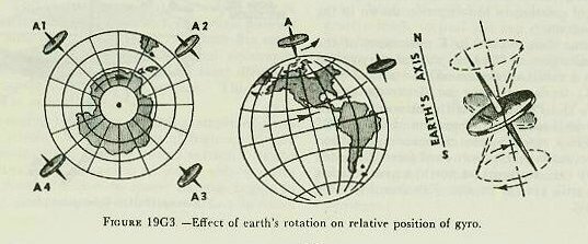| 19G4. Effect of the earth�s rotation Further consideration will indicate that the horizontal plane necessary for purposes of fire control is a plane tangent to the earth�s surface at the ship�s position. A gyroscope originally set in this plane will not remain in the horizontal, as the earth rotates, unless some means is provided to compensate for the effect of earth�s rotation. A gyro located at either pole will be unaffected, as the plane tangent to the earth at these points remains fixed in space. On the other hand, a gyro located at the equator will assume the successive positions with respect to the earth shown in figure 19G3 (A). To an observer standing on the earth, the wheel will turn completely over every 12 hours; that is, turn backward with respect to the earth�s rotation at the rate of one revolution in 24 hours. At any point between the pole and the equator, as shown in figure 19G3 (B) the wheel gyrates once every 24 hours about an axis parallel to the axis of the earth�s rotation and in a direction opposite to that of earth�s rotation. This effect can be compensated for if the gyro can be made to precess slowly to the eastward at the same rate as the earth�s rotation. The gyro�s plane of rotation will then remain parallel to the horizontal plane. This is accomplished in the stable vertical by means of a latitude weight which is so arranged that the effect of the weight is to cause a downward pressure at the north point of the gyro wheel, resulting in an easterly precession. The position of the latitude weight is adjustable, so that it can be set for the latitude in which the ship is operating. Actually, the mercury control system would tend to keep the gyro spin axis vertical, but if the mercury control were acting alone, the gyro would still tend to deviate slightly from the vertical as a result of the apparent precession caused by the earth�s rotation. The latitude weight compensates for this error. |