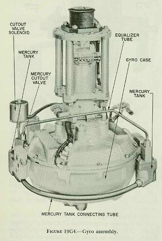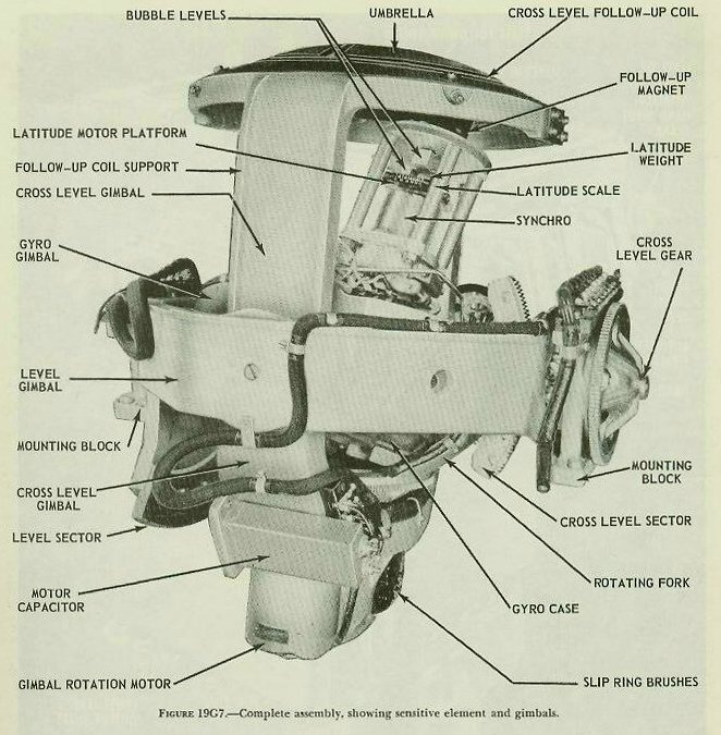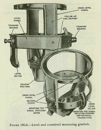 | 19G5. Mechanical construction The Mark 41 stable vertical consists essentially of a sensitive element and a measuring group. The sensitive element is the heart of the instrument and consists of the gyro, gyro case, gyro gimbal, and a fork-shaped support known as the rotating fork. Figure 19G4 shows the gyro proper. The wheel is carried on an axle supported by ball bearings at the upper and lower ends of the gyro case, the wheel and case forming the rotor and stator of a high-frequency induction motor. The squirrel-cage winding, consisting of solid conducting bars, is in the gyro wheel, while the wire stator windings are in the gyro case. A special motor-generator is provided to supply power at a frequency sufficient to drive the gyro at about 8,500 revolutions per minute. The gyro assembly of figure 19G4 pivots within the gyro gimbal on a case axis perpendicular to the spin axis, as shown in figure 19G5. The gimbal ring, in turn, is supported by the arms of the rotating fork on the gimbal axis, which is perpendicular to both the case axis and the spin axis. This axis arrangement provides a universal mounting giving the gyro three degrees of freedom, and allows it to spin on a vertical axis, even though the rotating fork may vary its from time to time. The measuring group consists of a level gimbal, a crosslevel gimbal, and a training gear. Figure 19G6 shows the arrangement of the measuring gimbals. The outer gimbal is he level gimbal, supported at its trunnion bearings by the training-gear structure (main frame). The level gimbal, in turn, supports the inner or crosslevel gimbal, so that its axis is perpendicular to the level-gimbal axis. At the lower end of the crosslevel gimbal the bearing for the rotating fork can be seen. The entire sensitive-element assembly of figure 19G5 is mounted within the measuring-gimbal system of figure 19G6, being supported at its lower end by the rotating fork in its fork bearing, so that it is free to rotate within the measuring group. The complete assembly is shown in figure 19G7. A gimbal rotation motor, attached to the lower end of the crosslevel gimbal, is geared to the rotating fork and drives it at about 18 revolutions per minute. The fork turns the entire sensitive element at this speed within the measuring-gimbal system. This rotation is essential to the mercury control system. |
