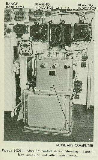 figure 20D1, is located in each fire control station. The computer is an auxiliary instrument for use in secondary or auxiliary control, or when the rangekeeper in the plotting room is inoperative. It is smaller and simpler than the Rangekeeper Mark 8. The predictions are less accurate than are those of the rangekeeper, and therefore more corrections may have to be introduced by hand. Unlike the range-keeper which produces gun orders, the auxiliary computer produces only sight angle and sight deflection.