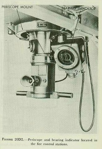 figure 20D2, supports a rotatable periscope, whose relative bearing angle is shown on an attached bearing indicator. The instrument is used for locating targets, and information thus obtained is telephoned to other stations.