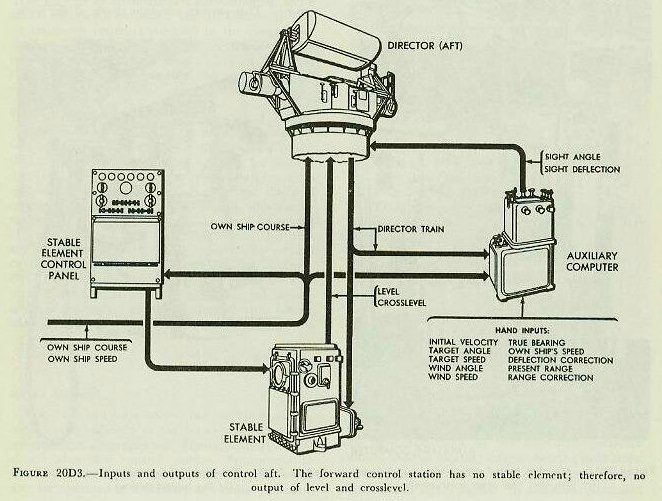 The auxiliary computer solves the fire control problem (for sight angle and sight deflection) for all movements of target and ship, and for wind across the line of sight. Director train is relayed to the computer by a target-bearing receiver.
