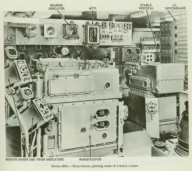 The principal items of equipment in the plotting room are: the Gun Director Mark 41 (stable vertical), with its control panel; the Rangekeeper Mark 8, the radar equipment associated with the forward director, and the main-battery fire control switchboard. In addition to these principal items, there are a gun train order relay transmitter, bearing indicators, range indicators, multiple turret train indicators, a graphic plotter on the range-keeper, director train indicators, telephone equipment, and various switches and signal lights. Some ships are provided with a dead-reckoning tracer in main-battery Plot.
