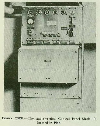 figure 20E8. it contains the various switches, fuses, signal lights, and other apparatus necessary for the control of the stable vertical. The stable vertical panel also contains the switches operating the mercury cut-out valve which prevents malfunctioning of the gyro during high-rate maneuvers of own ship. These switches require synchro inputs of own-ship speed and course for their operation.