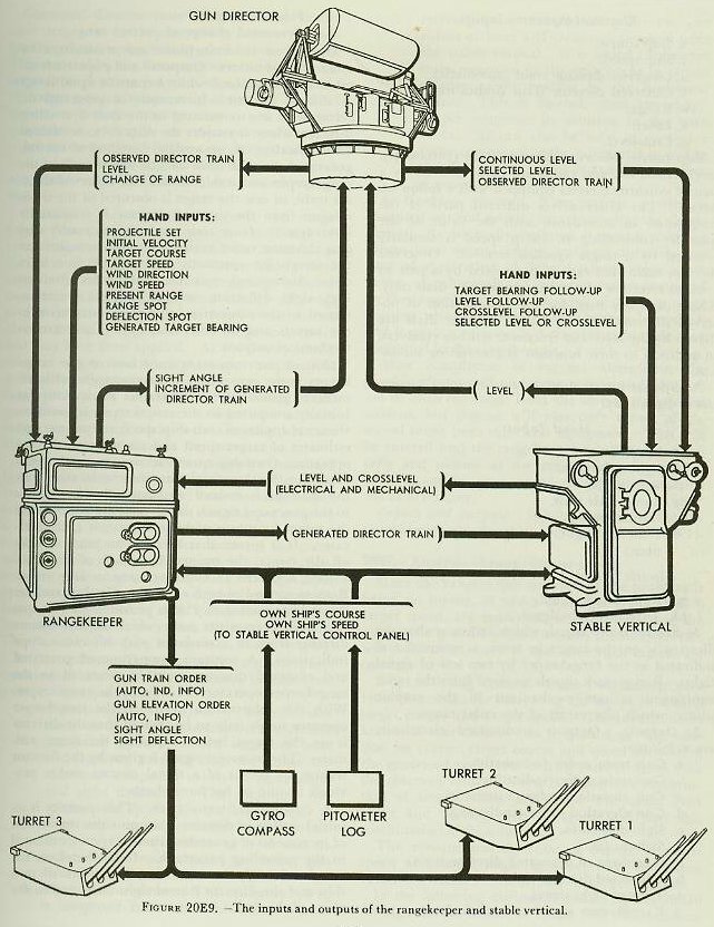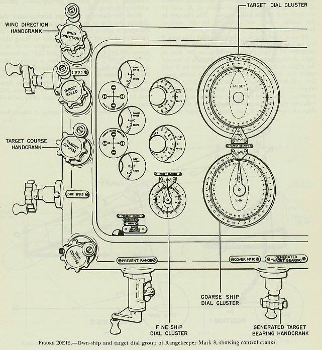 The rangekeeper includes most of the controlling, computing, and transmitting fire control mechanisms for the battery. The instrument is a combined rangekeeper, bearing keeper, predictor, deck-tilt corrector, trunnion-tilt corrector, and graphic plotter. Given the hand and automatic inputs listed below, the instrument will compute, indicate, and transmit electrically the information necessary to point the guns and set the sights continuously, and to train the directors and radar antennas continuously on the target. Outputs include the necessary corrections for drift, for wind, for variation in initial velocity, for relative movement of ship and target, for tilt of the gun trunnions from a horizontal plane (trunnion tilt) and for inclination of the director roller path from a horizontal plane (deck tilt). A time-of-flight signal mechanism, which electrically actuates local and distant buzzers indicating the fall of salvos, is included. The graphic plotter automatically plots ranges, sight deflection and time, and the magnitude and time of application of range and deflection corrections. The rangekeeper is equipped with synchro transmitters and receivers, which are used for all electrical inputs and outputs, except for those received by signal lights and those transmitted to lights or buzzers.