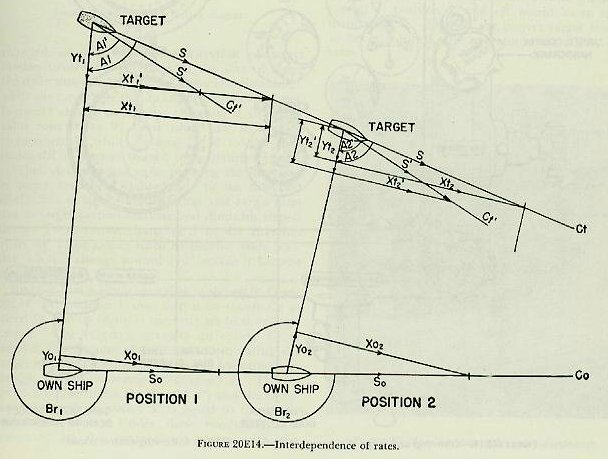 At position 1, computed dR was correct. But computed RdBs was in error by the difference between Xt1 and Xt’1. The only set-up of the range-keeper which would produce the correct values of RdBs and dR at the same time is that in which A and S are used for the settings. Had both range and bearing rates been correctly set on the instrument at position 1, both of these rates would be correct at position 2, and cR would be in agreement with R. Thus, if the correct target track is to be established, the operator must adjust both rates.