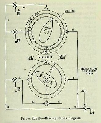 Bearing indicator. This device (see fig. 20E1) indicates true target bearing, relative target bearing, and own-ship course. It is used for information purposes and is the same as those used in the fire control stations.