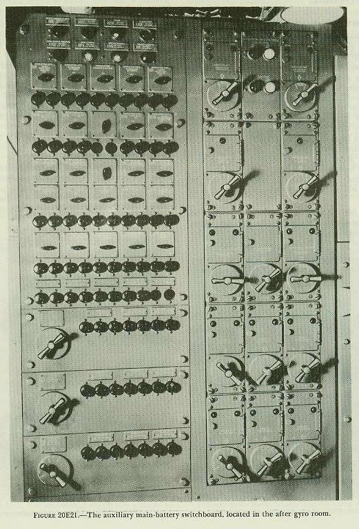 In the event of casualties to the main-battery switchboard, gun orders can be routed from the directors to the turrets via the auxiliary switch-board. This board is located in the after gyro room and is connected with directors 1 and 2 and with turrets 1 to 3 by cables run in separate wire-ways widely separated from the primary cables. In order to shift control of the system to the auxiliary main-battery switchboard, switches located at the fire control stations and turrets are shifted from MAIN to AUX position.