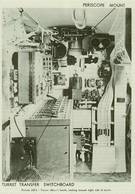 Figure 20F2 shows the periscope mounted in the roof of the turret, which serves for general lookout purposes; for picking up targets; for estimating their range, course, and speed; and for spotting the fall of shells.