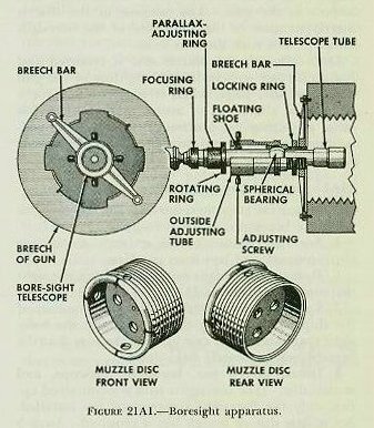 A. Alignment of Gun Sights 21A1. Introduction No matter how well the elements of a gun battery and fire control system function individually, they cannot function as a system unless they are properly aligned with each other. Battery alignment is the process of aligning all instruments and guns to a common system of reference points, lines, and planes. This process ensures that all associated gun bores, lines of sight and radar beams are parallel when: 1. Dials are matched with correct follow-the-pointer indications, 2. No parallax corrections are made, and 3. No ballistic corrections are made. It ensures further that they remain parallel throughout their operating motions, and that all instrument dials and automatic control equipment measure these motions correctly with respect to the proper reference. The original alignment of a ship’s battery involves (1) the mechanical alignment of the parts making up each element, and (2) the alignment of the various elements with one another. Alignment of parts within an element is largely a matter of design and installation; however, the gunnery officer should be able to check this alignment, and assure himself that it is accurate. Alignment of the various elements with one another is a primary concern of the gunnery officer, who should be familiar with methods employed in effecting the original alignment (in drydock) and should be able to make provision for routine checking and adjustment of the alignment when at sea. The purpose of the train alignment is to adjust the battery so that the lines of sight of directors and guns and axes of gun bores are parallel at all angles of train, when no ballistics or horizontal parallax are considered and the dials are matched. The purpose of alignment in elevation is to adjust the battery so that at any angle of train and elevation the lines of sight of directors and guns and the bore axes will all be elevated at exactly the same angle above a common reference plane, provided that no vertical parallax is introduced, no ballistics are considered, and the dials are matched. This chapter will discuss the alignment procedures employed in drydock and afloat. Under either condition, train alignment is conducted separately from and completed prior to elevation alignment. 21A2. Gun sight alignment Gun sight alignment is that part of battery alignment which involves the mechanical alignment of the parts making up each element, namely, alignment within each mount, turret, or gun of the battery. Gun sight alignment is usually the initial step in battery alignment and consists of three procedures: 1. Boresighting. The pointer’s and trainer’s telescopes do not lie on the axis of the bore. For firing at short ranges in local control they must, therefore, be aligned so that their sighting axes intersect the extension of the bore axis at the target. Since, however, the gun bore is only a few feet from the sights, the error which may be caused by parallel alignment is very small. Thus, for battle use, gun sights may be aligned either to mean battle range for the battery involved or along parallel lines (converging at infinity). 2. Checking for lost motion. The values of sight angle and sight deflection as set on the sights must not contain inaccuracies due to lost motion in the sight mechanism. 3. Checking for parallelism of sights. Sight angle or range settings must elevate or depress the sighting axis of the telescopes in a plane perpendicular to the trunnion axes, and deflection settings must move the sighting axes of the telescopes in a plane parallel to the trunnion axes; in other words the sights must be aligned for parallelism. 21A3. Boresighting The object of boresighting is to make the sight axes and the bore axis converge at either: (1) a specified range, or (2) infinity, with the range scale and the deflection scale reading their zero value in either case. In order to adjust the sights in this manner, use must be made of a boresight telescope. This is a telescope which may be mounted in the bore of a gun and adjusted so that its line of sight coincides with the axis of the bore. Then by sighting through this telescope and through the sight telescopes simultaneously, the latter may be adjusted to obtain convergence or parallelism. There are two main types of boresights: the breech-bar boresight and the boresight with self-contained optics. A breech-bar boresight consists of (1) a boresight telescope, (2) an adapter for installing the telescope in the gun, and (3) muzzle disc used for aligning the telescope on the axis of the bore. With bag-type guns, the adapter takes the form of a breech bar that can be installed across the screw box. A breech-bar boresight can also be used for boresighting a 5”/38 gun, but with a different type of adapter. The same boresight telescope can be used in boresighting all guns from 5-inch to 16-inch caliber (except the dual-purpose 6”/47 and the rapid-fire 8”/55), if provided with the proper adapters and muzzle discs. Boresights with self-contained optics vary in construction and even in principle of operation, from those that consist merely of a fitting with a small hole for the breech end and another with a pair of cross-wires at the muzzle end, to those that convert the gun into a huge (but low-power) telescope. Self-contained optics boresights are made to fit only the guns for which they are designed. No parts of them are interchangeable between guns. The boresighting process with either major type of boresight is substantially similar, except that breech-bar boresight telescopes must first be aligned on the gun bore axis by sighting on the muzzle disc. This step is not necessary when using boresights with self-contained optics. This section describes boresighting with a breech-bar boresight, which requires this extra operation. |
